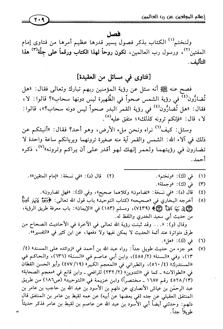 فصح عنه -صلى اللَّه عليه وسلم- أنه سئل عن رؤية المؤمنين ربهم تبارك وتعالى فقال: "هل تُضارُّون (٤) في رؤية الشمس صحوًا في الظهيرة ليس دونها سحاب"؟ قالوا: لا، فقال: "هل تُضارُّون (٤) في رؤية القمر البدر صحوًا ليس دونه سحاب؟ "، قالوا: لا، قال: "فإنكم ترونه كذلك"؛ متفق عليه (٥).