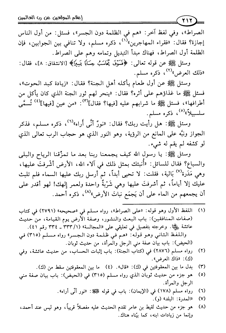 (١) اللفظ الأول وهو قوله: "على الصراط"، رواه مسلم في "صحيحه" (٢٧٩١) في كتاب (صفات المنافقين): باب البعث والنشور، وصفة الأرض يوم القيامة، من حديث عائشة -رضي اللَّه عنها-. وخرجته بتفصيل في تعليقي على "المجالسة" (١/ ٣٣٣ - ٣٣٤ رقم ٤١).