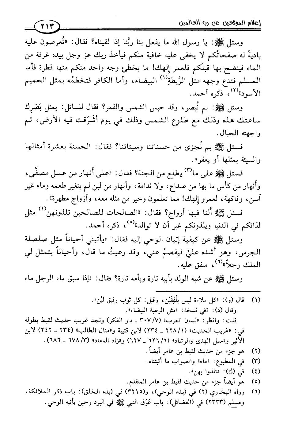 وسئل -صلى اللَّه عليه وسلم-: يا رسول اللَّه ما يفعل بنا ربُّنا إذا لقيناه؟ فقال: "تُعرضون عليه باديةً له صفحاتُكم لا يخفى عليه خافية منكم فيأخذ ربك عز وجل بيده غرفة من الماء فينضح بها قبلَكم فلعمر إِلهك! ما يخطئ وجه واحد منكم منها قطرة فأما المسلم فتدع وجهه مثل الرَّيطةِ (١) البيضاء، وأما الكافر فتخطمُه بمثل الحميم الأسود" (٢)، ذكره أحمد.