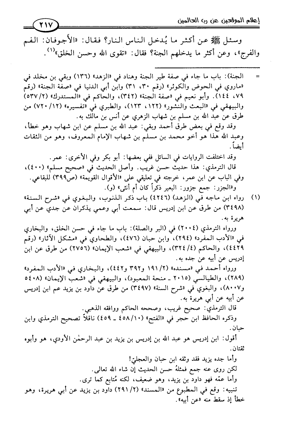 ورواه الترمذي (٢٠٠٤) في (البر والصلة): باب ما جاء في حسن الخلق، والبخاري في "الأدب المفرد" (٢٩٤)، وابن حبان (٤٧٦)، والطحاوي في "مشكل الآثار" (رقم ٤٤٢٩)، والحاكم (٤/ ٣٢٤)، والبيهقي في "شعب الإيمان" (٢٧٥٦) من طرق عن ابن إدريس عن أبيه عن جده به.