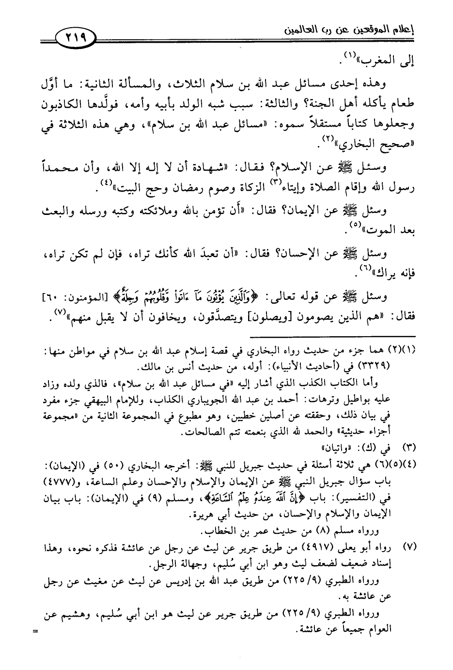 (٤) و (٥) و (٦) هي ثلاثة أسئلة في حديث جبريل للنبي -صلى اللَّه عليه وسلم-: أخرجه البخاري (٥٠) في (الإيمان): باب سؤال جبريل النبي -صلى اللَّه عليه وسلم- عن الإيمان والإِسلام والإحسان وعلم الساعة، و (٤٧٧٧) في (التفسير): باب {إِنَّ اللَّهَ عِنْدَهُ عِلْمُ السَّاعَةِ}، ومسلم (٩) في (الإيمان): باب بيان الإيمان والإِسلام والإحسان, من حديث أبي هريرة.