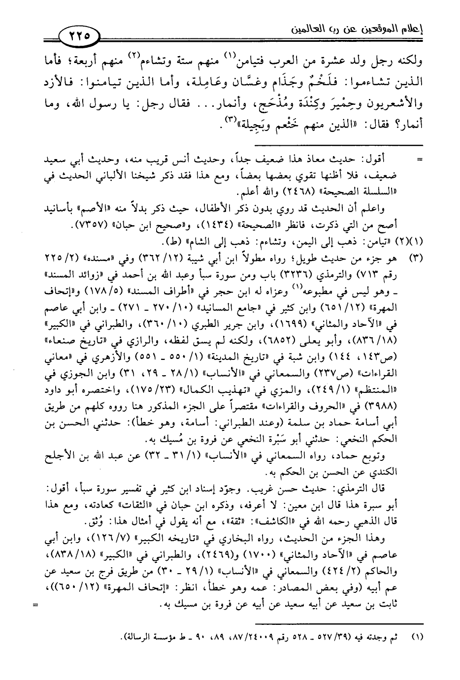 (٣) هو جزء من حديث طويل؛ رواه مطولًا ابن أبي شيبة (١٢/ ٣٦٢) وفي "مسنده" (٢/ ٢٢٥ رقم ٧١٣) والترمذي (٣٢٣٦) باب ومن سورة سبأ وعبد اللَّه بن أحمد في "زوائد المسند" -وهو ليس في مطبوعه (١) وعزاه له ابن حجر في "أطراف المسند" (٥/ ١٧٨) و"إتحاف المهرة" (١٢/ ٦٥١) وابن كثير في "جامع المسانيد" (١٠/ ٢٧٠ - ٢٧١) - وابن أبي عاصم في "الآحاد والمثاني" (١٦٩٩)، وابن جرير الطبري (١٠/ ٣٦٠)، والطبراني في "الكبير" (١٨/ ٨٣٦)، وأبو يعلى (٦٨٥٢)، ولكنه لم يسق لفظه، والرازي في "تاريخ صنعاء" (ص ١٤٣، ١٤٤) وابن شبة في "تاريخ المدينة" (١/ ٥٥٠ - ٥٥١) والأزهري في "معاني القراءات" (ص ٢٣٧) والسمعاني في "الأنساب" (١/ ٢٨ - ٢٩، ٣١) وابن الجوزي في "المنتظم" (١/ ٢٤٩)، والمزي في "تهذيب الكمال" (٢٣/ ١٧٥)، واختصره أبو داود (٣٩٨٨) في "الحروف والقراءات" مقتصرًا على الجزء المذكور هنا رووه كلهم من طريق أبي أسامة حماد بن سلمة (وعند الطبراني: أسامة، وهو خطأ): حدثني الحسن بن الحكم النخعي: حدثني أبو سَبْرة النخعي عن فروة بن مُسيك به.