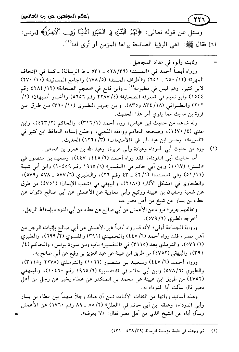 (١) ثم وجدته في طبعة مؤسسة الرسالة (٣٩/ ٥٢٨ - ٥٣١).
