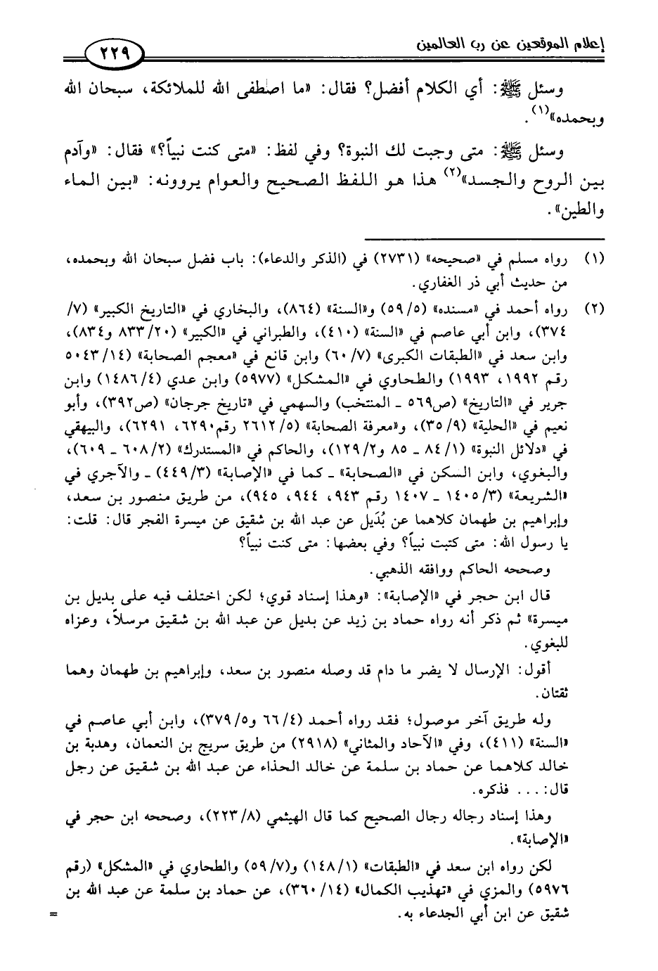 (٢) رواه أحمد في "مسنده" (٥/ ٥٩) و"السنة" (٨٦٤)، والبخاري في "التاريخ"الكبير" (٧/ ٣٧٤)، وابن أبي عاصم في "السنة" (٤١٠)، والطبراني في "الكبير" (٢٠/ ٨٣٣ و ٨٣٤)، وابن سعد في "الطبقات الكبرى" (٧/ ٦٠) وابن قانع في "معجم الصحابة" (١٤/ ٥٠٤٣ رقم ١٩٩٢، ١٩٩٣) والطحاوي في "المشكل" (٥٩٧٧) وابن عدي (٤/ ١٤٨٦) وابن جرير في "التاريخ" (ص ٥٦٩ - المنتخب) والسهمي في "تاريخ جرجان" (ص ٣٩٢)، وأبو نعيم في "الحلية" (٩/ ٣٥)، و"معرفة الصحابة" (٥/ ٢٦١٢ رقم ٦٢٩٠، ٦٢٩١)، والبيهقي في "دلائل النبوة" (١/ ٨٤ - ٨٥ و ٢/ ١٢٩)، والحاكم في "المستدرك" (٢/ ٦٠٨ - ٦٠٩)، والبغوي، وابن السكن في "الصحابة" -كما في "الإصابة" (٣/ ٤٤٩) - والآجري في "الشريعة" (٣/ ١٤٠٥ - ١٤٠٧ رقم ٩٤٣، ٩٤٤، ٩٤٥)، من طريق منصور بن سعد، وإبراهيم بن طهمان كلاهما عن بُدَيل عن عبد اللَّه بن شقيق عن ميسرة الفجر قال: قلت: يا رسول اللَّه: متى كتبت نبيًا؟ وفي بعضها: متى كنت نبيًا؟