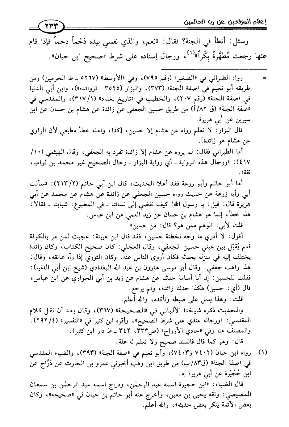 = رواه الطبراني في "الصغير" (رقم ٧٩٥)، وفي "الأوسط" (٥٢٦٧ - ط الحرمين) ومن طريقه أبو نعيم في "صفة الجنة" (٣٧٣)، والبزار (٣٥٢٥ - "زوائده")، وابن أبي الدنيا في "صفة الجنة" (رقم ٢٠٧)، والخطيب في "تاريخ بغداد" (١/ ٣١٧)، والمقدسي في "صفة الجنة" (ق ٨٢/ أ) من طريق حسين الجعفي عن زائدة عن هشام بن حسان عن ابن سيرين عن أبي هريرة.
