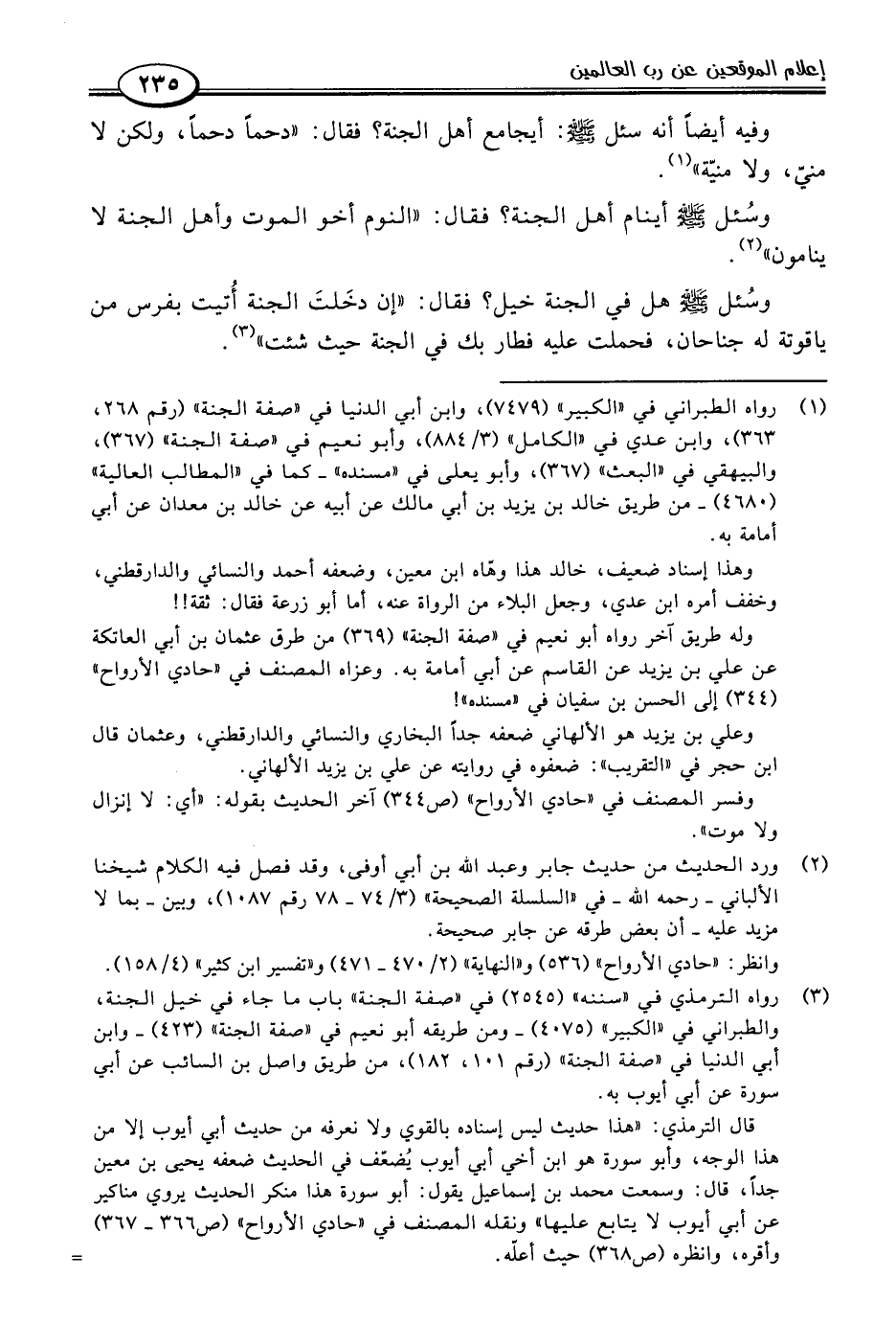 (١) رواه الطبراني في "الكبير" (٧٤٧٩)، وابن أبي الدنيا في "صفة الجنة" (رقم ٢٦٨، ٣٦٣)، وابن عدي في "الكامل" (٣/ ٨٨٤)، وأبو نعيم في "صفة الجنة" (٣٦٧)، والبيهقي في "البعث" (٣٦٧)، وأبو يعلى في "مسنده" -كما في "المطالب العالية" (٤٦٨٠) - من طريق خالد بن يزيد بن أبي مالك عن أبيه عن خالد بن معدان عن أبي أمامة به.
