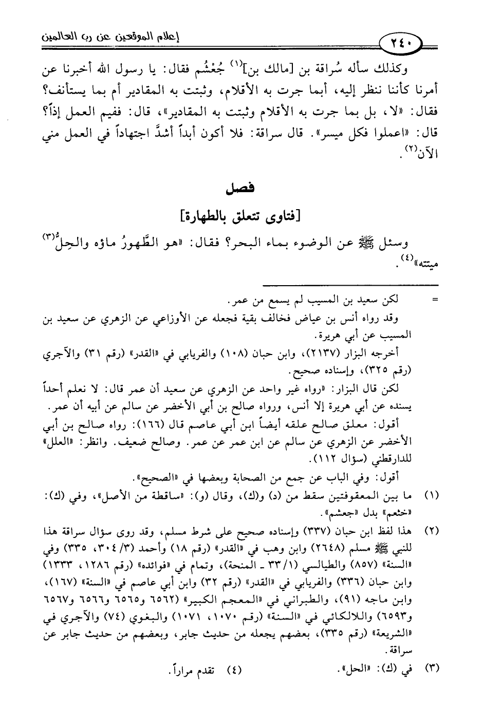 (٢) هذا لفظ ابن حبان (٣٣٧) وإسناده صحيح على شرط مسلم، وقد روى سؤال سراقة هذا للنبي -صلى اللَّه عليه وسلم- مسلم (٢٦٤٨) وابن وهب في "القدر" (رقم ١٨) وأحمد (٣/ ٣٠٤، ٣٣٥) وفي "السنة" (٨٥٧) والطيالسي (١/ ٣٣ - المنحة)، وتمام في "فوائده" (رقم ١٢٨٦، ١٣٣٣) وابن حبان (٣٣٦) والفريابي في "القدر" (رقم ٣٢) وابن أبي عاصم في "السنة" (١٦٧)، وابن ماجه (٩١)، والطبراني في "المعجم الكبير" (٦٥٦٢ و ٦٥٦٥ و ٦٥٦٦ و ٦٥٦٧ و ٦٥٩٣) واللالكائي في "السنة" (رقم ١٠٧٠، ١٠٧١) والبغوي (٧٤) والآجري في "الشريعة" (رقم ٣٣٥)، بعضهم يجعله من حديث جابر، وبعضهم من حديث جابر عن سراقة.