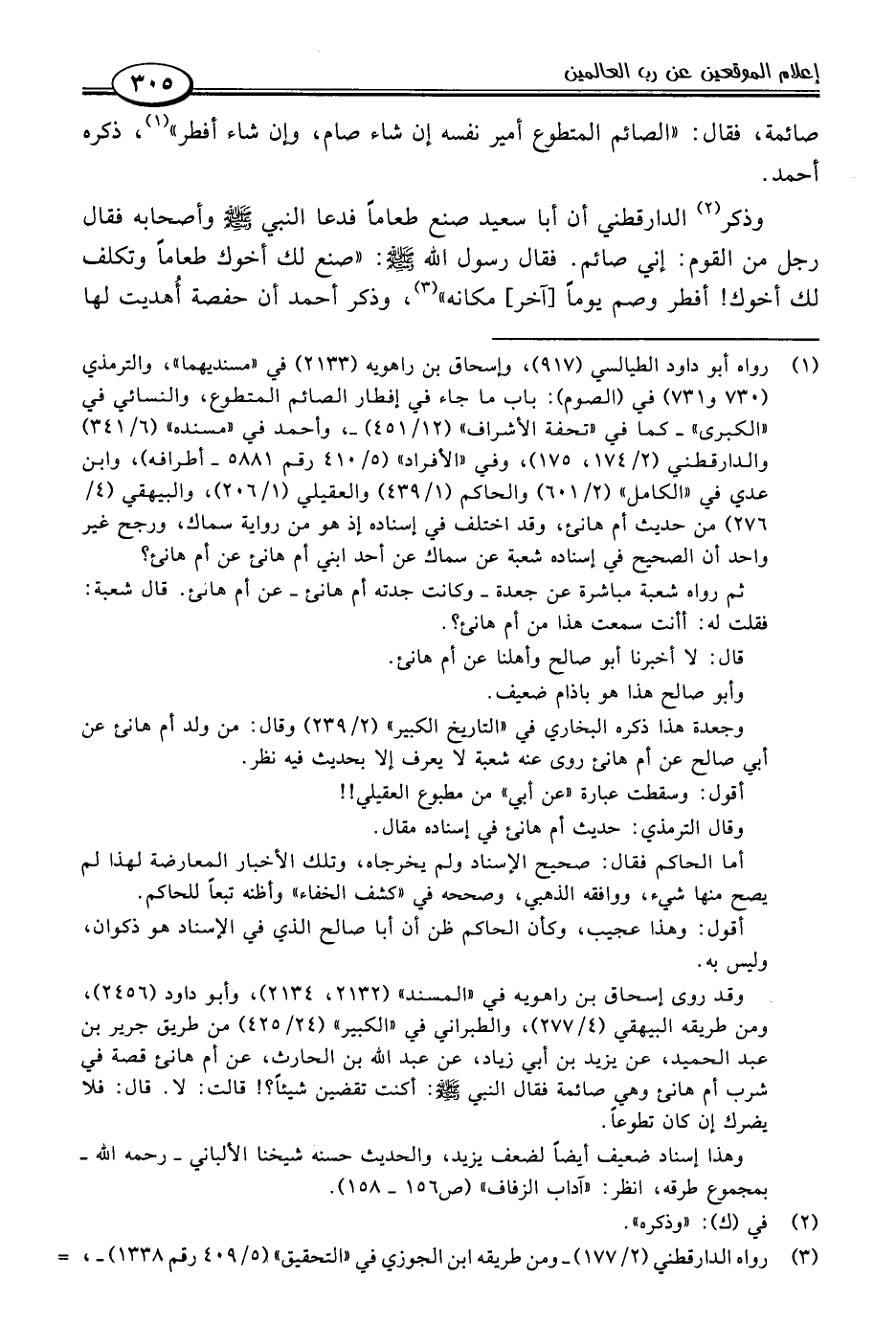 (١) رواه أبو داود الطيالسي (٩١٧)، وإسحاق بن راهويه (٢١٣٣) في "مسنديهما"، والترمذي (٧٣٠ و ٧٣١) في (الصوم): باب ما جاء في إفطار الصائم المتطوع، والنسائي في "الكبرى" -كما في "تحفة الأشراف" (١٢/ ٤٥١) -، وأحمد في "مسنده" (٦/ ٣٤١) والدارقطني (٢/ ١٧٤، ١٧٥)، وفي "الأفراد" (٥/ ٤١٠ رقم ٥٨٨١ - أطرافه)، وابن عدي في "الكامل" (٢/ ٦٠١) والحاكم (١/ ٤٣٩) والعقيلي (١/ ٢٠٦)، والبيهقي (٤/ ٢٧٦) من حديث أم هانئ، وقد اختلف في إسناده إذ هو من رواية سماك، ورجح غير واحد أن الصحيح في إسناده شعبة عن سماك عن أحد ابني أم هانئ عن أم هانئ؟