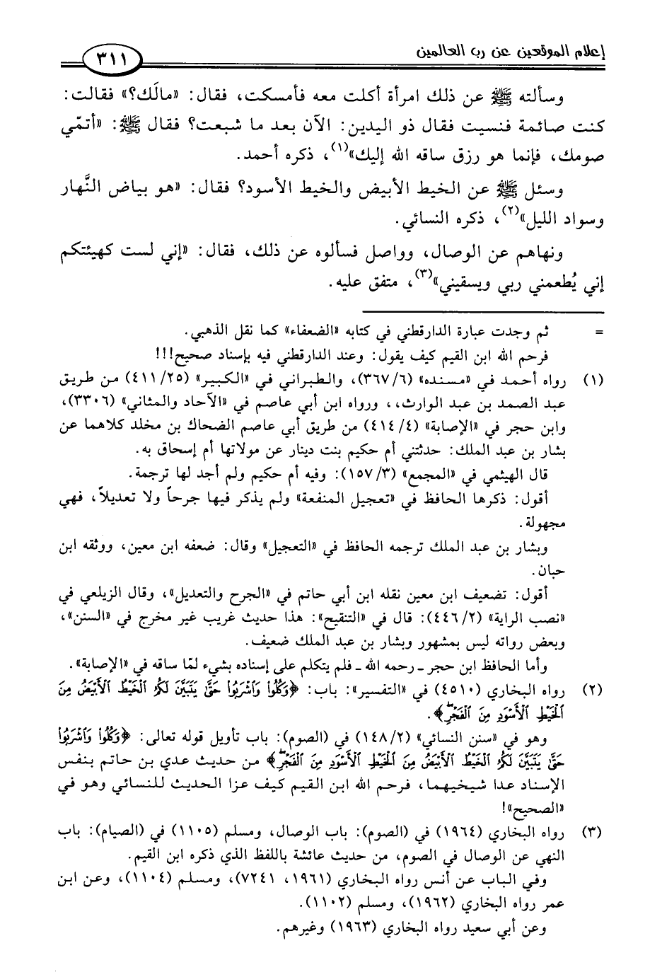 (٣) رواه البخاري (١٩٦٤) في (الصوم): باب الوصال، ومسلم (١١٠٥) في (الصيام): باب النهي عن الوصال في الصوم، من حديث عائشة باللفظ الذي ذكره ابن القيم.