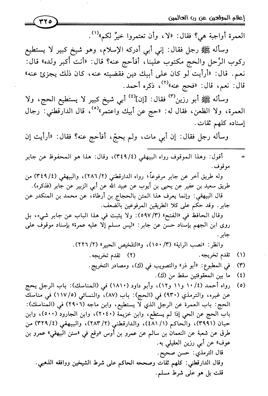 (٥) رواه أحمد (٤/ ١٠ و ١١ و ١٢)، وأبو داود (١٨١٠) في (المناسك): باب الرجل يحج عن غيره، والترمذي (٩٣٠) في (الحج): باب (٨٧)، والنسائي (٥/ ١١٧) في مناسك الحج: باب العمرة عن الرجل الذي لا يستطيع، وابن ماجه (٢٩٠٦) في (المناسك): باب الحج عن الحي إذا لم يستطع، وابن خزيمة (٢٠٤٠)، وابن الجارود (٥٥٠)، وابن حبان (٣٩٩١)، والحاكم (١/ ٤٨١)، والدارقطني (٢/ ٢٨٣)، والبيهقي (٤/ ٣٢٩) من طرق عن شعبة عن النعمان بن سالم عن عمرو بن أوس "وقع في "سنن البيهقي" عمرو بن عوف" عن أبي رزين العقيلي به.