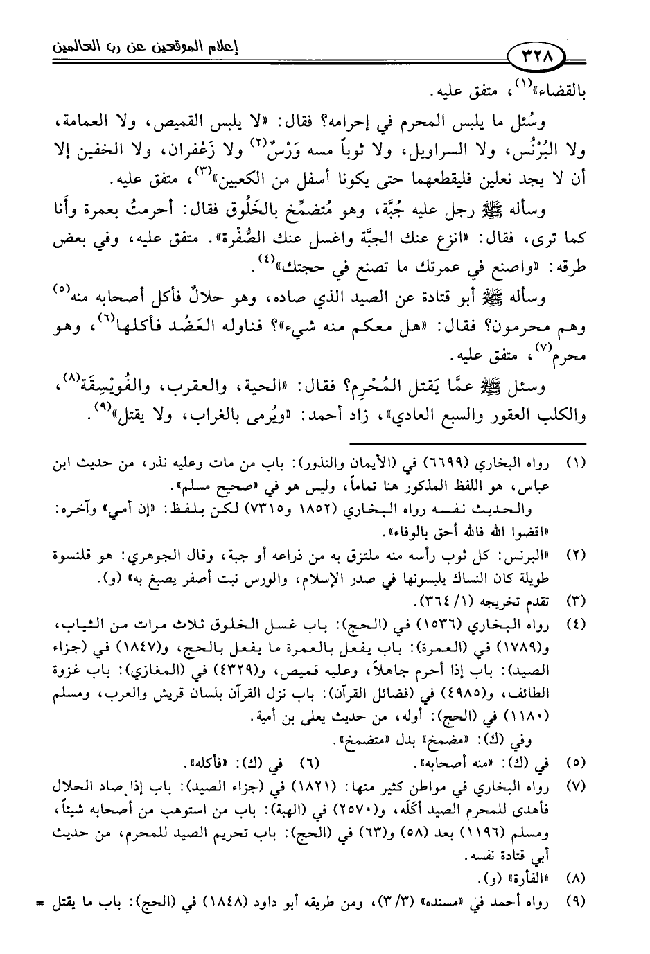 (٤) رواه البخاري (١٥٣٦) في (الحج): باب غسل الخلوق ثلاث مرات من الثياب، و (١٧٨٩) في (العمرة): باب يفعل بالعمرة ما يفعل بالحج، و (١٨٤٧) في (جزاء الصيد): باب إذا أحرم جاهلًا، وعليه قميص، و (٤٣٢٩) في (المغازي): باب غزوة الطائف، و (٤٩٨٥) في (فضائل القرآن): باب نزل القرآن بلسان قريش والعرب، ومسلم (١١٨٠) في (الحج): أوله، من حديث يعلى بن أمية.