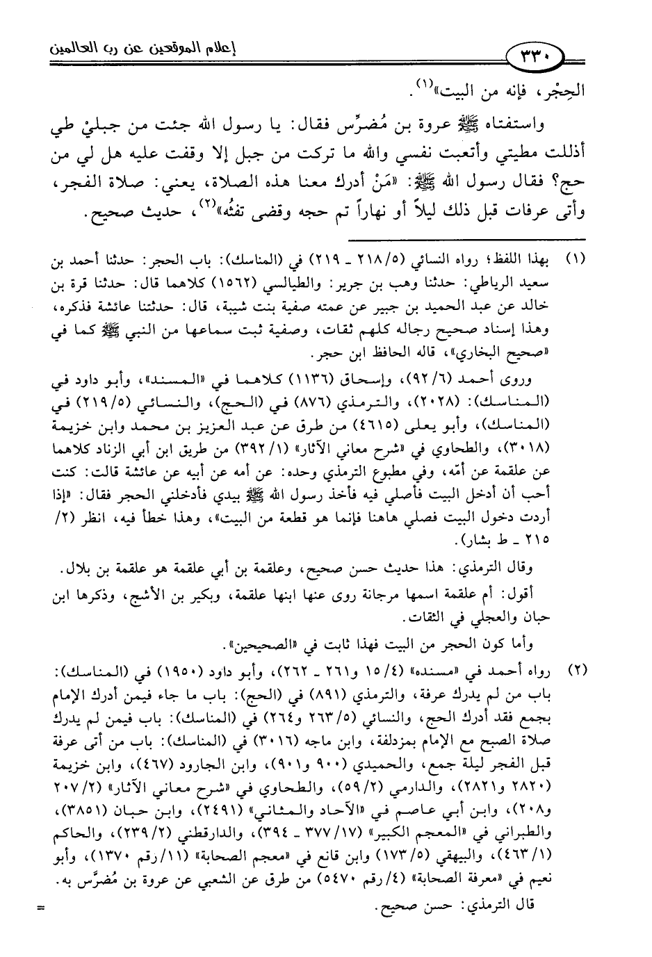 (٢) رواه أحمد في "مسنده" (٤/ ١٥ و ٢٦١ - ٢٦٢)، وأبو داود (١٩٥٠) في (المناسك): باب من لم يدرك عرفة، والترمذي (٨٩١) في (الحج): باب ما جاء فيمن أدرك الإمام بجمع فقد أدرك الحج، والنسائي (٥/ ٢٦٣ و ٢٦٤) في (المناسك): باب فيمن لم يدرك صلاة الصبح مع الإمام بمزدلفة، وابن ماجه (٣٠١٦) في (المناسك): باب من أتى عرفة قبل الفجر ليلة جمع، والحميدي (٩٠٠ و ٩٠١)، وابن الجارود (٤٦٧)، وابن خزيمة (٢٨٢٠ و ٢٨٢١)، والدارمي (٢/ ٥٩)، والطحاوي في "شرح معاني الآثار" (٢/ ٢٠٧ و ٢٠٨)، وابن أبي عاصم في "الآحاد والمثاني" (٢٤٩١)، وابن حبان (٣٨٥١)، والطبراني في "المعجم الكبير" (١٧/ ٣٧٧ - ٣٩٤)، والدارقطني (٢/ ٢٣٩)، والحاكم (١/ ٤٦٣)، والبيهقي (٥/ ١٧٣) وابن قانع في "معجم الصحابة" (١١/ رقم ١٣٧٠)، وأبو نعيم في "معرفة الصحابة" (٤/ رقم ٥٤٧٠) من طرق عن الشعبي عن عروة بن مُضرَّس به.