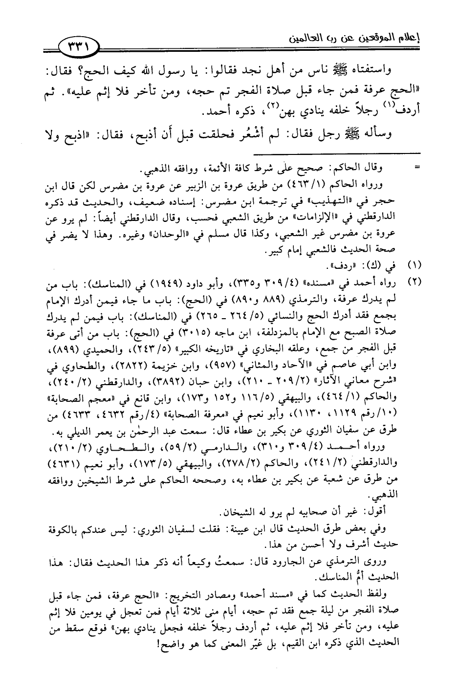 ولفظ الحديث كما في "مسند أحمد" ومصادر التخريج: "الحج عرفة، فمن جاء قبل صلاة الفجر من ليلة جمع فقد تم حجه، أيام منى ثلاثة أيام فمن تعجل في يومين فلا إثم عليه، ومن تأخر فلا إثم عليه، ثم أردف رجلًا خلفه فجعل ينادي بهن" فوقع سقط من الحديث الذي ذكره ابن القيم، بل غيّر المعنى كما هو واضح!