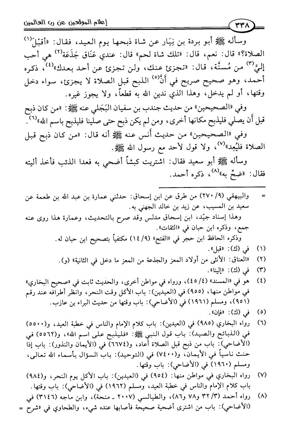 (٦) رواه البخاري (٩٨٥) في (العيدين): باب كلام الإمام والناس في خطبة العيد، و (٥٥٠٠) في (الذبائح والصبد): باب قول النبي -صلى اللَّه عليه وسلم-: "فليذبح على اسم اللَّه"، و (٥٥٦٢) في (الأضاحي): باب من ذبح قبل الصلاة أعاد، و (٦٦٧٤) في (الأيمان والنذور): باب إذا حنث ناسيًا في الأيمان، و (٧٤٠٠) في (التوحيد): باب السؤال بأسماء اللَّه تعالى، ومسلم (١٩٦٠) في (الأضاحي): باب وقتها.