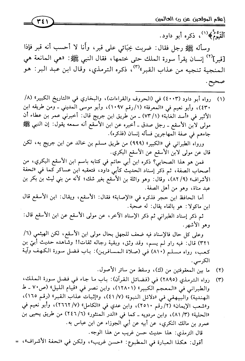 وسأله -صلى اللَّه عليه وسلم- رجل فقال: ضربت خِبَائي على قبر، وأَنا لا أحسب أنه قبر فإذا [قبر] (٢) إنسان يقرأ سورة الملك حتى ختمها، فقال النبي -صلى اللَّه عليه وسلم-: "هي المانعة هي المنجية تنجيه من عذاب القبر" (٣)، ذكره الترمذي، وقال ابن عبد البر: هو صحيح.