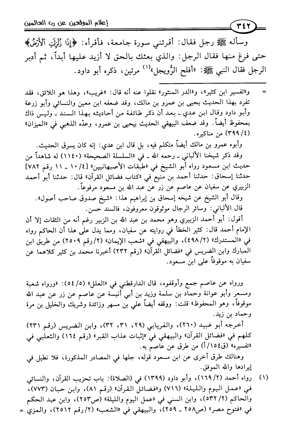 ورواه عن عاصم جمع وأوقفوه، قال الدارقطني في "العلل" (٥/ ٥٤): "ورواه شعبة ومسعر وأبو عوانة وحماد بن سلمة وزيد بن أبي أنيسة عن عاصم عن زر عن عبد اللَّه موقوفًا، وهو المحفوظ" قلت: ووقفه أيضًا علي بن مسهر وزائدة وشريك والخليل بن مرة وحماد بن زيد.