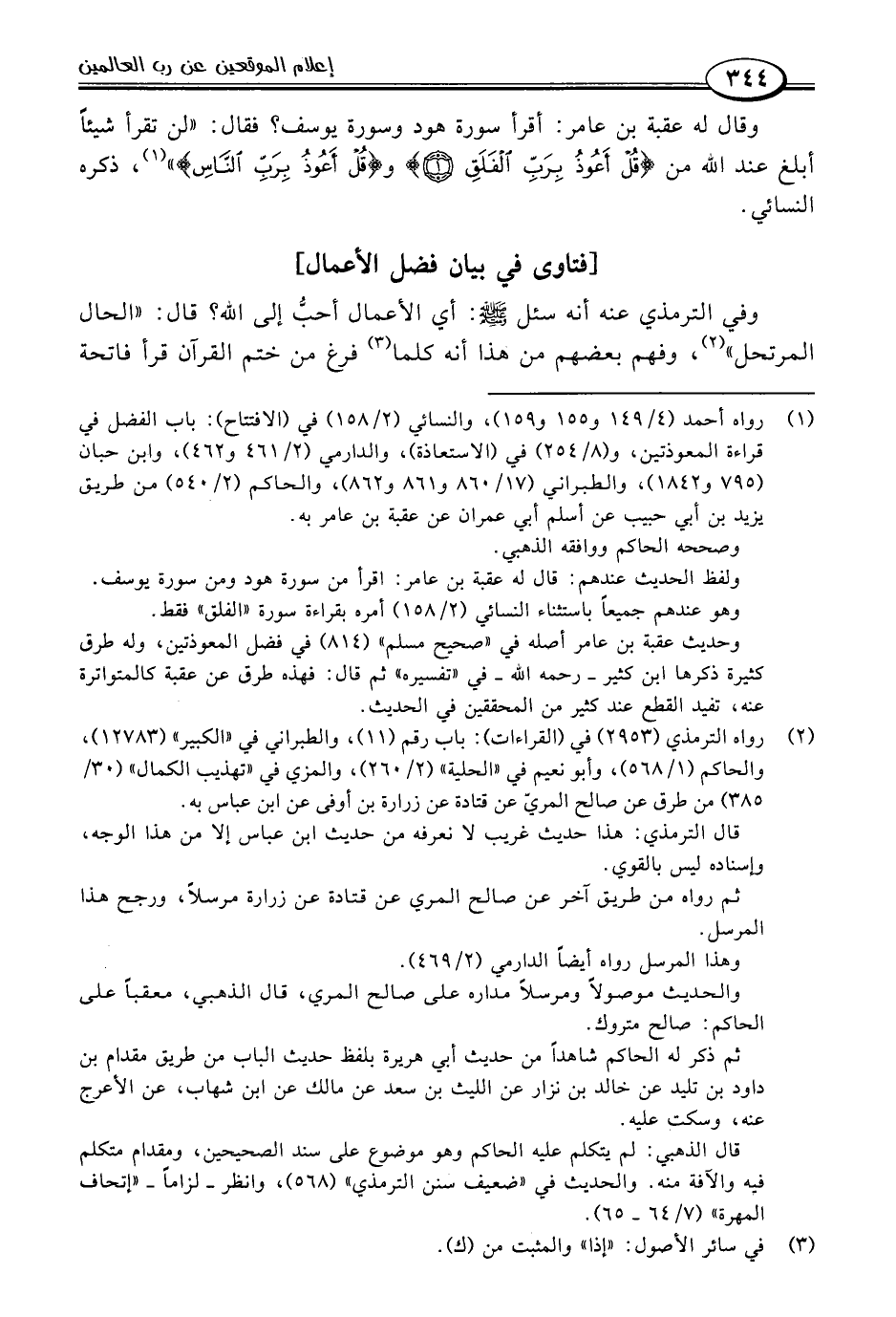 وحديث عقبة بن عامر أصله في "صحيح مسلم" (٨١٤) في فضل المعوذتين، وله طرق كثيرة ذكرها ابن كثير -رحمه اللَّه- في "تفسيره" ثم قال: فهذه طرق عن عقبة كالمتواترة عنه، تفيد القطع عند كثير من المحققين في الحديث.