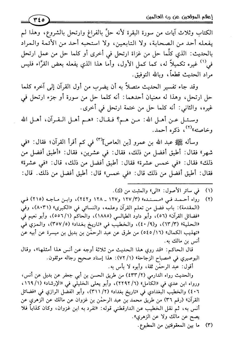 الكتاب وثلاث آيات من سورة البقرة لأنه حلَّ بالفراغ وارتحل بالشروع، وهذا لم يفعله أحد من الصحابة، ولا التابعين، ولا استحبه أحد من الأئمة والمراد بالحديث: الذي كلَّما حل من غزاة ارتحل في أخرى أو كلما حل من عمل ارتحل في (١) غيره تكميلًا له، كما كمل الأول، وأما هذا الذي يفعله بعض القرَّاء فليس مراد الحديث قطعًا، وباللَّه التوفيق.