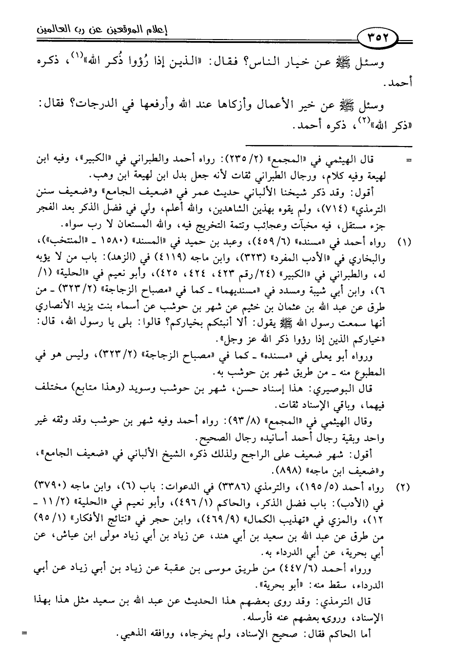 (١) رواه أحمد في "مسنده" (٦/ ٤٥٩)، وعبد بن حميد في "المسند" (١٥٨٠ - "المنتخب")، والبخاري في "الأدب المفرد" (٣٢٣)، وابن ماجة (٤١١٩) في (الزهد): باب من لا يؤبه له، والطبراني في "الكبير" (٢٤/ رقم ٤٢٣، ٤٢٤، ٤٢٥)، وأبو نعيم في "الحلية" (١/ ٦)، وابن أبي شيبة ومسدد في "مسنديهما" -كما في "مصباح الزجاجة" (٢/ ٣٢٣) - من طرق عن عبد اللَّه بن عثمان بن خثيم عن شهر بن حوشب عن أسماء بنت يزيد الأنصاري أنها سمعت رسول اللَّه -صلى اللَّه عليه وسلم- يقول: ألا أنبئكم بخياركم؟ قالوا: بلى يا رسول اللَّه، قال: "خياركم الذين إذا رؤوا ذكر اللَّه -عز وجل-".