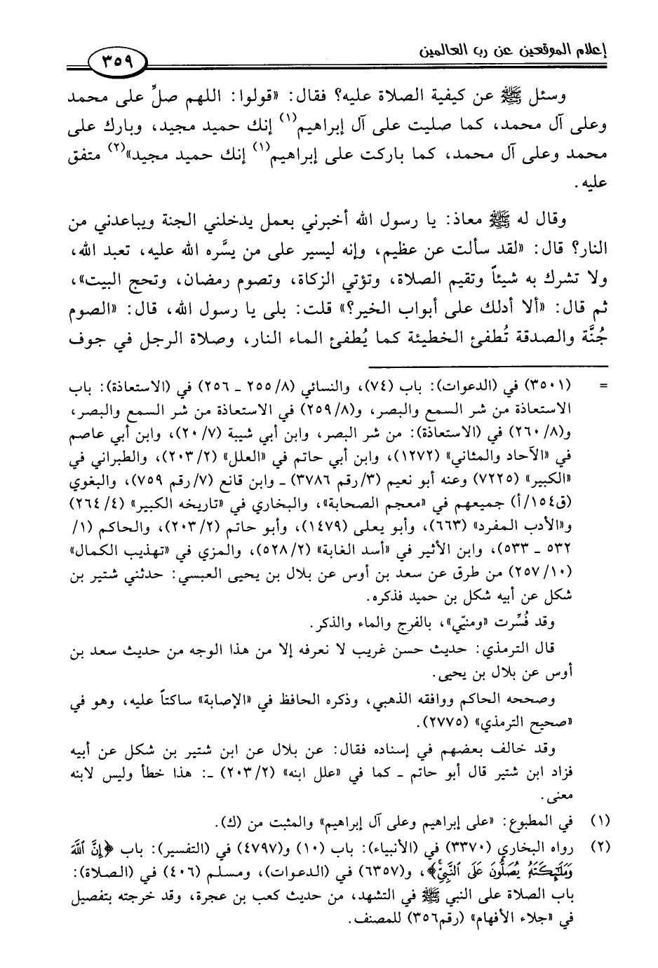 (٢) رواه البخاري (٣٣٧٠) في (الأنبياء): باب (١٠) و (٤٧٩٧) في (التفسير): باب {إِنَّ اللَّهَ وَمَلَائِكَتَهُ يُصَلُّونَ عَلَى النَّبِيِّ}، و (٦٣٥٧) في (الدعوات)، ومسلم (٤٠٦) في (الصلاة): باب الصلاة على النبي -صلى اللَّه عليه وسلم- في التشهد، من حديث كعب بن عجرة، وقد خرجته بتفصيل في "جلاء الأفهام" (رقم ٣٥٦) للمصنف.