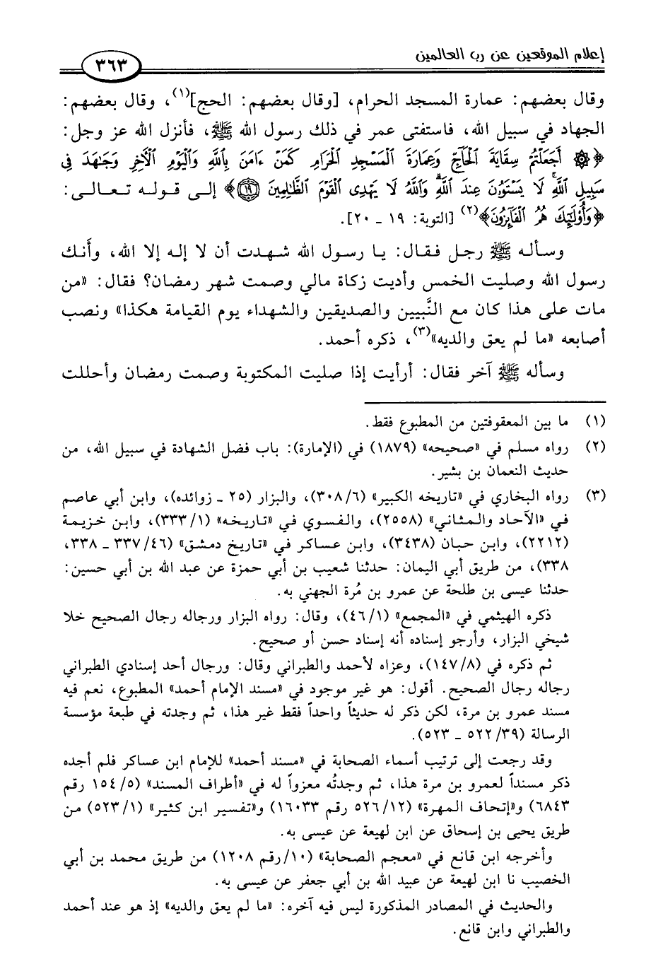 (٢) رواه مسلم في "صحيحه" (١٨٧٩) في (الإمارة): باب فضل الشهادة في سبيل اللَّه، من حديث النعمان بن بشير.