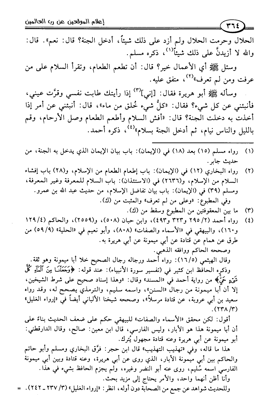 هذا ما قاله، وفي "تهذيب التهذيب" قال ابن حجر: فرَّق البخاري ومسلم وأبو حاتم والحاكم بين أبي ميمونة الأبار، الذي روى عن أبي هريرة، وعنه قتادة وبين أبي ميمونة الفارسي اسمه سُليم، روى عنه أبو النضر وغيره، ولم يجزم الحافظ بشيء في هذا.