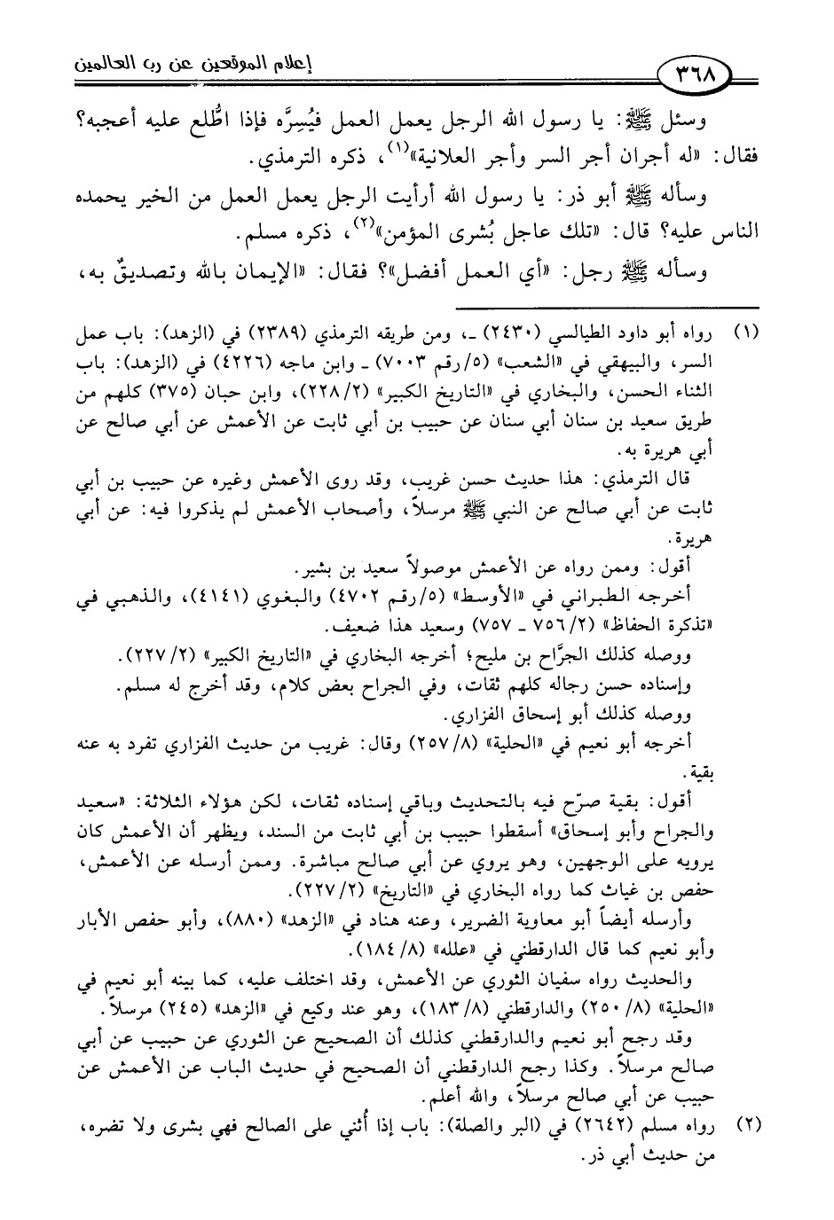 (٢) رواه مسلم (٢٦٤٢) في (البر والصلة): باب إذا أُثني على الصالح فهي بشرى ولا تضره، من حديث أبي ذر.