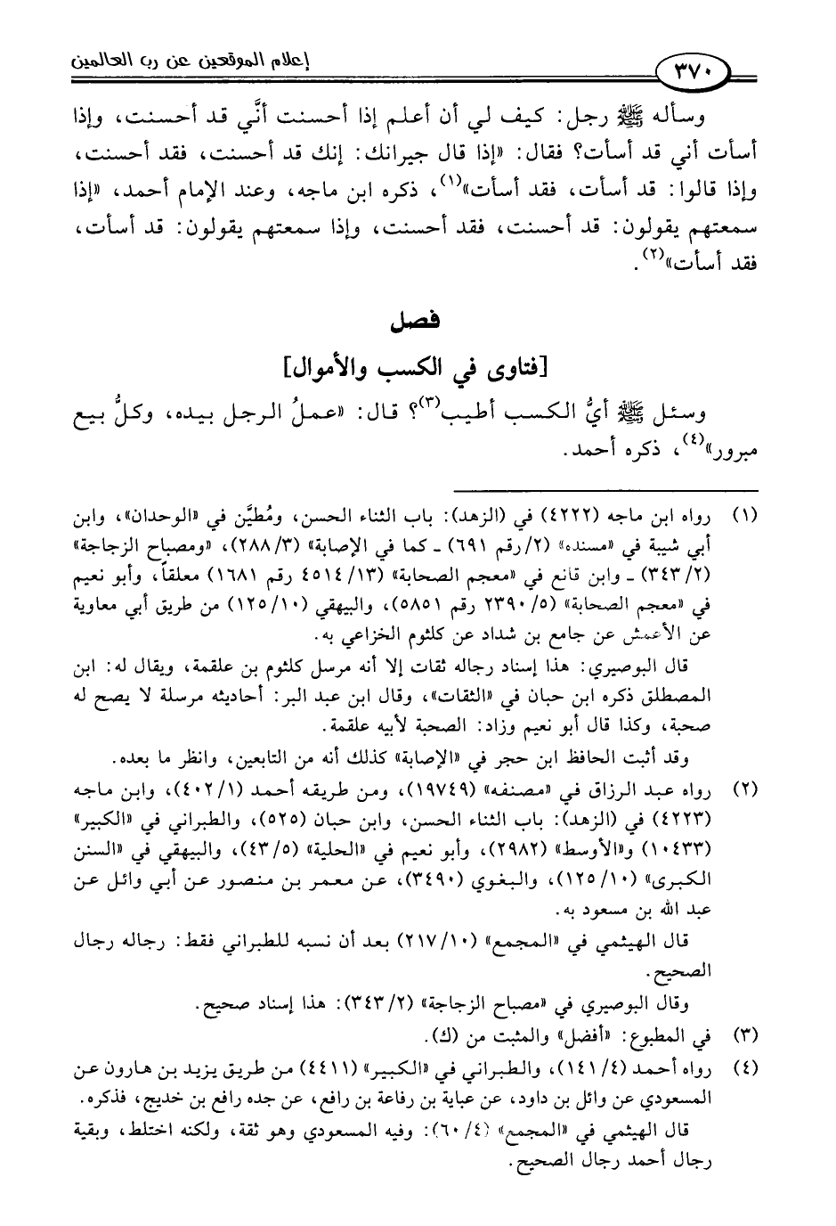 وسأله -صلى اللَّه عليه وسلم- رجل: كيف لي أن أعلم إذا أحسنت أنَّي قد أحسنت، وإذا أسأت أني قد أسأت؟ فقال: "إذا قال جيرانك: إنك قد أحسنت، فقد أحسنت، وإذا قالوا: قد أسأت، فقد أسأت" (١)، ذكره ابن ماجة، وعند الإمام أحمد، "إذا سمعتهم يقولون: قد أحسنت، فقد أحسنت، وإذا سمعتهم يقولون: قد أسأت، فقد أسأت" (٢).