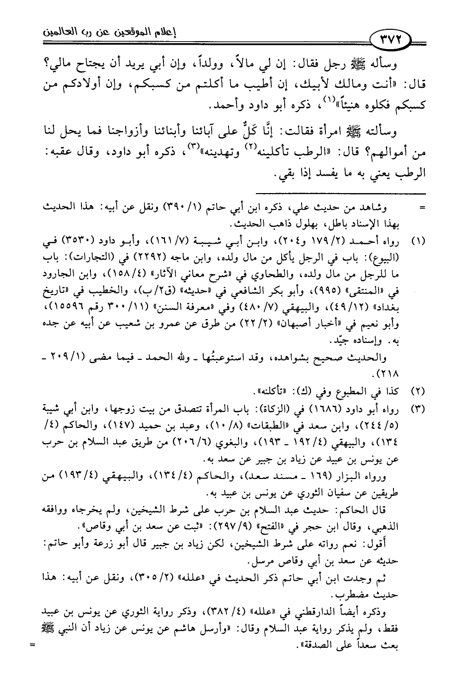 (١) رواه أحمد (٢/ ١٧٩ و ٢٠٤)، وابن أبي شيبة (٧/ ١٦١)، وأبو داود (٣٥٣٠) في (البيوع): باب في الرجل يأكل من مال ولده، وابن ماجة (٢٢٩٢) في (التجارات): باب ما للرجل من مال ولده، والطحاوي في "شرح معاني الآثار" (٤/ ١٥٨)، وابن الجارود في "المنتقى" (٩٩٥)، وأبو بكر الشافعي في "حديثه" (ق ٢/ ب)، والخطيب في "تاريخ بغداد" (١٢/ ٤٩)، والبيهقي (٧/ ٤٨٠) وفي "معرفة السنن" (١١/ ٣٠٠ رقم ١٥٥٩٦)، وأبو نعيم في "أخبار أصبهان" (٢/ ٢٢) من طرق عن عمرو بن شعيب عن أبيه عن جده به. وإسناده جيّد.