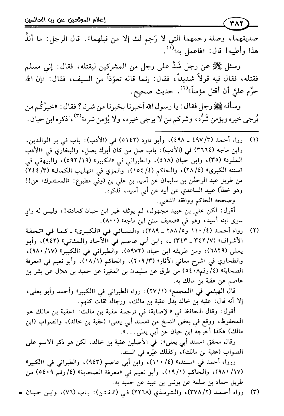وسئل -صلى اللَّه عليه وسلم- عن رجل شَدَّ على رجل من المشركين ليقتله، فقال: إني مسلم فقتله، فقال فيه قولًا شديدًا، فقال: إنما قاله تعوّذًا من السيف، فقال: "إن اللَّه حرَّم عليَّ أن أقتل مؤمنًا" (٢)، حديث صحيح.
