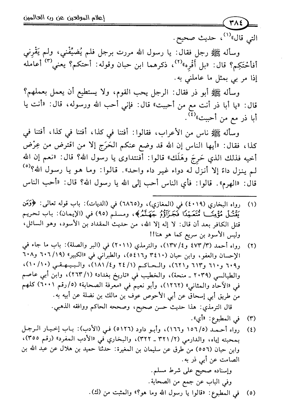 (٤) رواه أحمد (٥/ ١٥٦ و ١٦٦)، وأبو داود (٥١٢٦) في (الأدب): باب إخبار الرجل بمحبته إياه، والدارمي (٢/ ٣٢١ - ٣٢٢)، والبخاري في "الأدب المفرد" (رقم ٣٥٥)، وابن حبان (٥٥٦) من طرق عن سليمان بن المغيرة: حدثنا حميد بن هلال عن عبد اللَّه بن الصامت عن أبي ذر به.