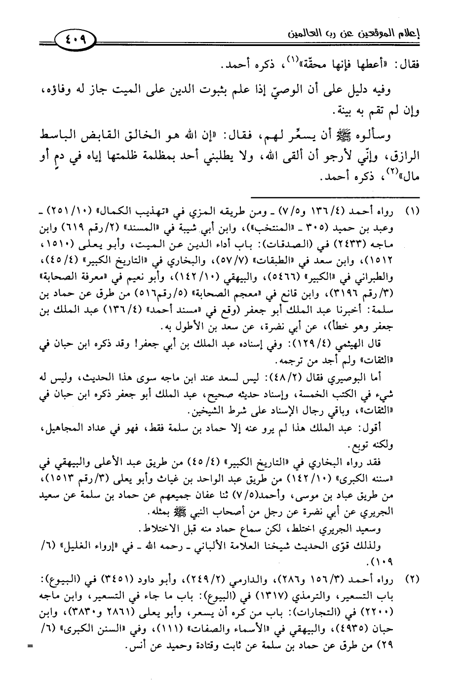 (٢) رواه أحمد (٣/ ١٥٦ و ٢٨٦)، والدارمي (٢/ ٢٤٩)، وأبو داود (٣٤٥١) في (البيوع): باب التسعير، والترمذي (١٣١٧) في (البيوع): باب ما جاء في التسعير، وابن ماجه (٢٢٠٥) في (التجارات): باب من كره أن يسعر، وأبو يعلى (٢٨٦١ و ٣٨٣٠)، وابن حبان (٤٩٣٥)، والبيهقي في "الأسماء والصفات" (١١١)، وفي "السنن الكبرى" (٦/ ٢٩) من طرق عن حماد بن سلمة عن ثابت وقتادة وحميد عن أنس. =