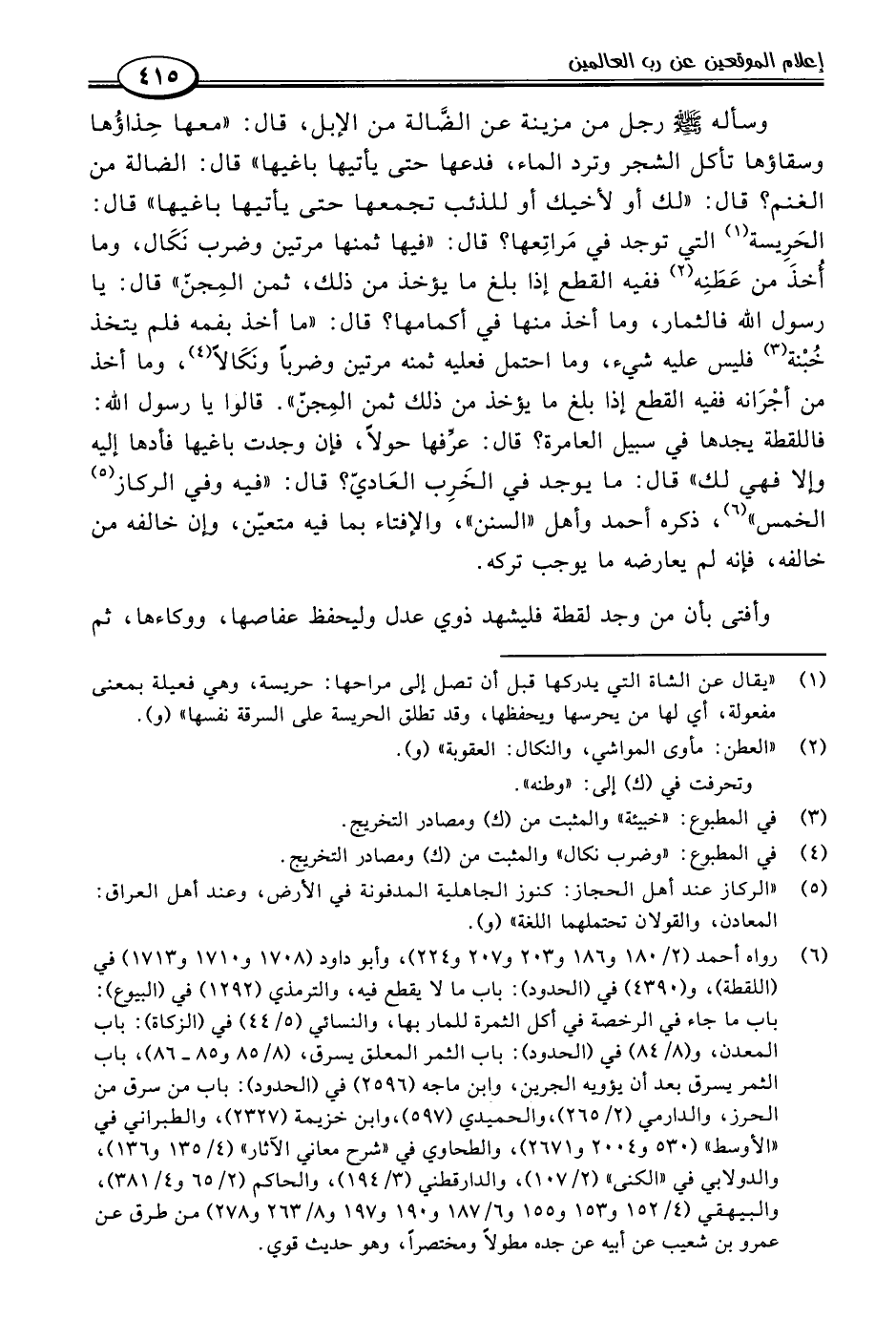 وسأله -صلى اللَّه عليه وسلم- رجل من مزينة عن الضَّالة من الإبل، قال: "معها حِذاؤُها وسقاؤها تأكل الشجر وترد الماء، فدعها حتى يأتيها باغيها" قال: الضالة من الغنم؟ قال: "لك أو لأخيك أو للذئب تجمعها حتى يأتيها باغيها" قال: الحَرِيسة (١) التي توجد في مَراتِعها؟ قال: "فيها ثمنها مرتين وضرب نَكَال، وما أُخذَ من عَطَنِه (٢) ففيه القطع إذا بلغ ما يؤخذ من ذلك، ثمن المِجنّ" قال: يا رسول اللَّه فالثمار، وما أخذ منها في أكمامها؟ قال: "ما أخذ بفمه فلم يتخذ خُبْنة (٣) فليس عليه شيء، وما احتمل فعليه ثمنه مرتين وضربًا ونَكَالًا (٤)، وما أخذ من أجْرَانه ففيه القطع إذا بلغ ما يؤخذ من ذلك ثمن المِجنّ". قالوا يا رسول اللَّه: فاللقطة يجدها في سبيل العامرة؟ قال: عرِّفها حولًا، فإن وجدت باغيها فأدها إليه وإلا فهي لك" قال: ما يوجد في الخَرِب العَاديّ؟ قال: "فيه وفي الركاز (٥) الخمس" (٦)، ذكره أحمد وأهل "السنن"، والإفتاء بما فيه متعيّن، وإن خالفه من خالفه، فإنه لم يعارضه ما يوجب تركه.