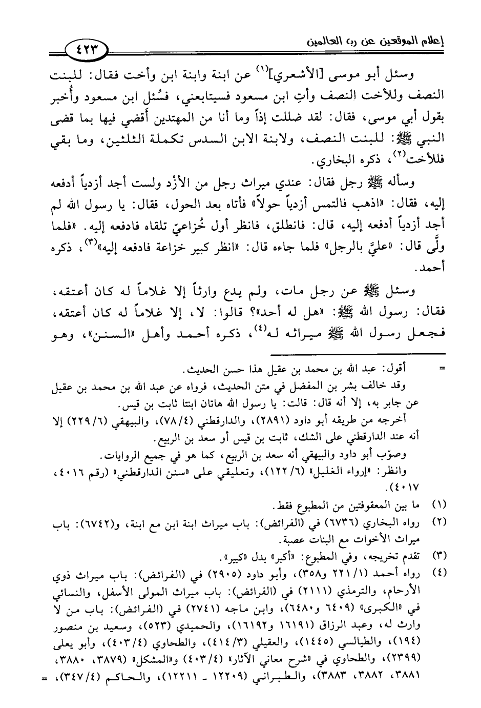 (٤) رواه أحمد (١/ ٢٢١ و ٣٥٨)، وأبو داود (٢٩٠٥) في (الفرائض): باب ميراث ذوي الأرحام، والترمذي (٢١١١) في (الفرائض): باب ميراث المولى الأسفل، والنسائي في "الكبرى" (٦٤٠٩ و ٦٤٨٠)، وابن ماجه (٢٧٤١) في (الفرائض): باب من لا وارث له، وعبد الرزاق (١٦١٩١ و ١٦١٩٢)، والحميدي (٥٢٣)، وسعيد بن منصور (١٩٤)، والطيالسي (١٤٤٥)، والعقيلي (٣/ ٤١٤)، والطحاوي (٤/ ٤٠٣)، وأبو يعلى (٢٣٩٩)، والطحاوي في "شرح معاني الآثار" (٤/ ٤٠٣) و"المشكل" (٣٨٧٩، ٣٨٨٠، ٣٨٨١، ٣٨٨٢، ٣٨٨٣)، والطبراني (١٢٢٠٩ - ١٢٢١١)، والحاكم (٤/ ٣٤٧)، =