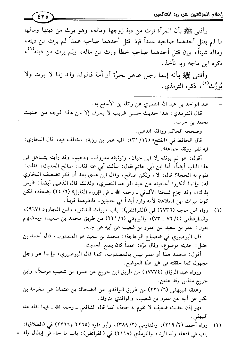 (١) رواه ابن ماجه (٢٧٣٦) في (الفرائض): باب ميراث القاتل، وابن الجارود (٩٦٧)، والدارقطني (٤/ ٧٢ - ٧٣)، والبيهقي (٦/ ٢٢١) من طريق محمد بن سعيد، وبعضهم لقول: عمر بن سعيد عن عمرو بن شعيب عن أبيه عن جده.