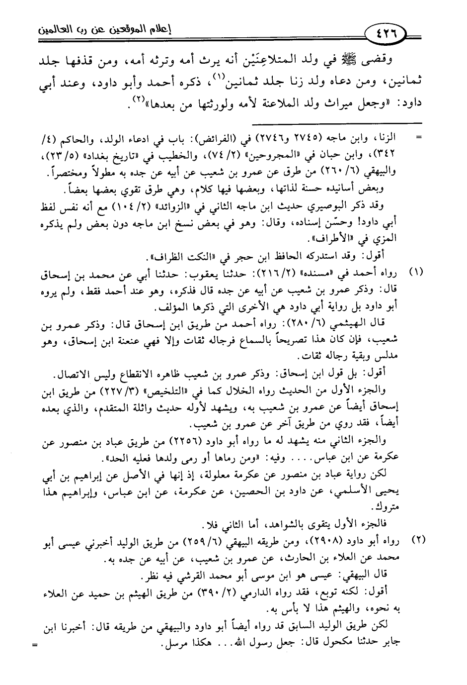 وقضى -صلى اللَّه عليه وسلم- في ولد المتلاعِنَيْن أنه يرث أمه وترثه أمه، ومن قذفها جلد ثمانين، ومن دعاه ولد زنا جلد ثمانين (١)، ذكره أحمد وأبو داود، وعند أبي داود: "وجعل ميراث ولد الملاعنة لأمه ولورثتها من بعدها" (٢).