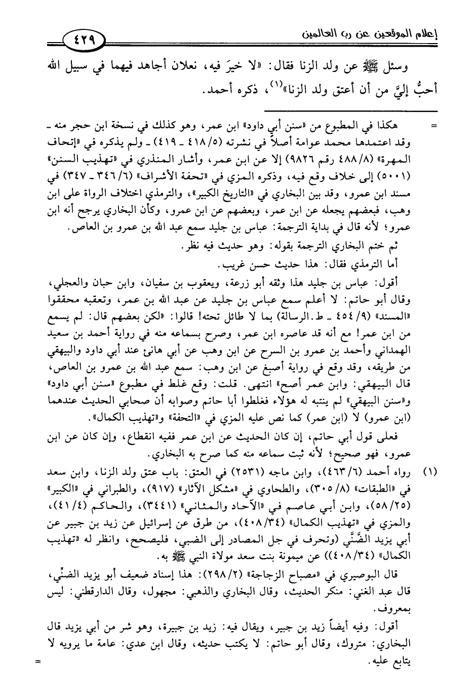 أقول: عباس بن جليد هذا وثقه أبو زرعة، ويعقوب بن سفيان، وابن حبان والعجلي، وقال أبو حاتم: لا أعلم سمع عباس بن جليد عن عبد اللَّه بن عمر، وتعقبه محققوا "المسند" (٩/ ٤٥٤ - ط. الرسالة) بما لا طائل تحته! قالوا: "لكن بعضهم قال: لم يسمع من ابن عمر! مع أنه قد عاصره ابن عمر، وصرح بسماعه منه في رواية أحمد بن سعيد الهمداني وأحمد بن عمرو بن السرح عن ابن وهب عن أبي هانئ عند أبي داود والبيهقي من طريقه، وقد وقع في رواية أصبغ عن ابن وهب: سمع عبد اللَّه بن عمرو بن العاص، قال البيهقي: وابن عمر أصح" انتهى. قلت: وقع غلط في مطبوع "سنن أبي داود" و"سنن البيهقي" لم ينتبه له هؤلاء فغلطوا أبا حاتم وصوابه أن صحابي الحديث عندهما (ابن عمرو) لا (ابن عمر) كما نص عليه المزي في "التحفة" و"تهذيب الكمال".