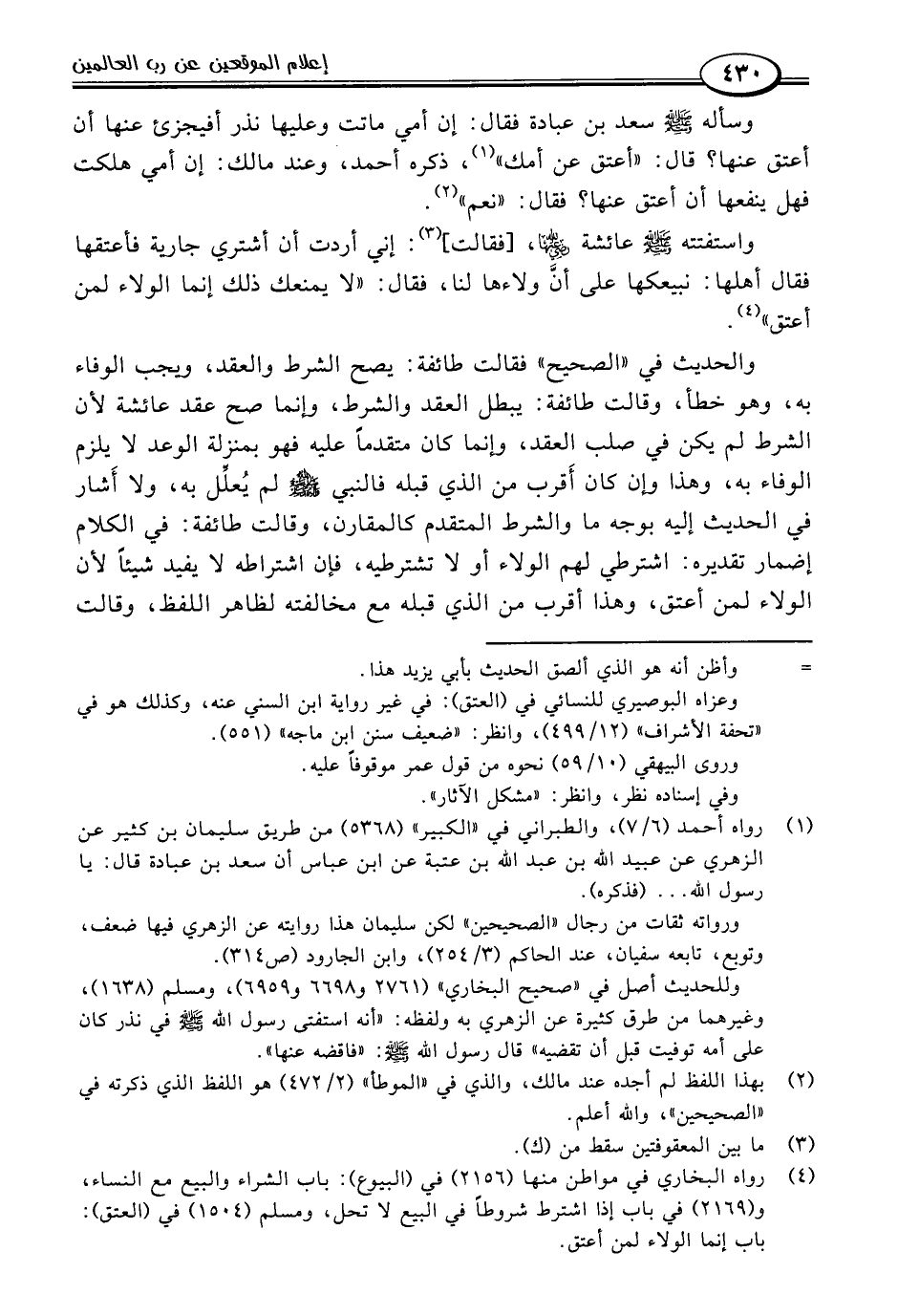 (٤) رواه البخاري في مواطن منها (٢١٥٦) في (البيوع): باب الشراء والبيع مع النساء، و (٢١٦٩) في باب إذا اشترط شروطًا في البيع لا تحل، ومسلم (١٥٠٤) في (العتق): باب إنما الولاء لمن أعتق.