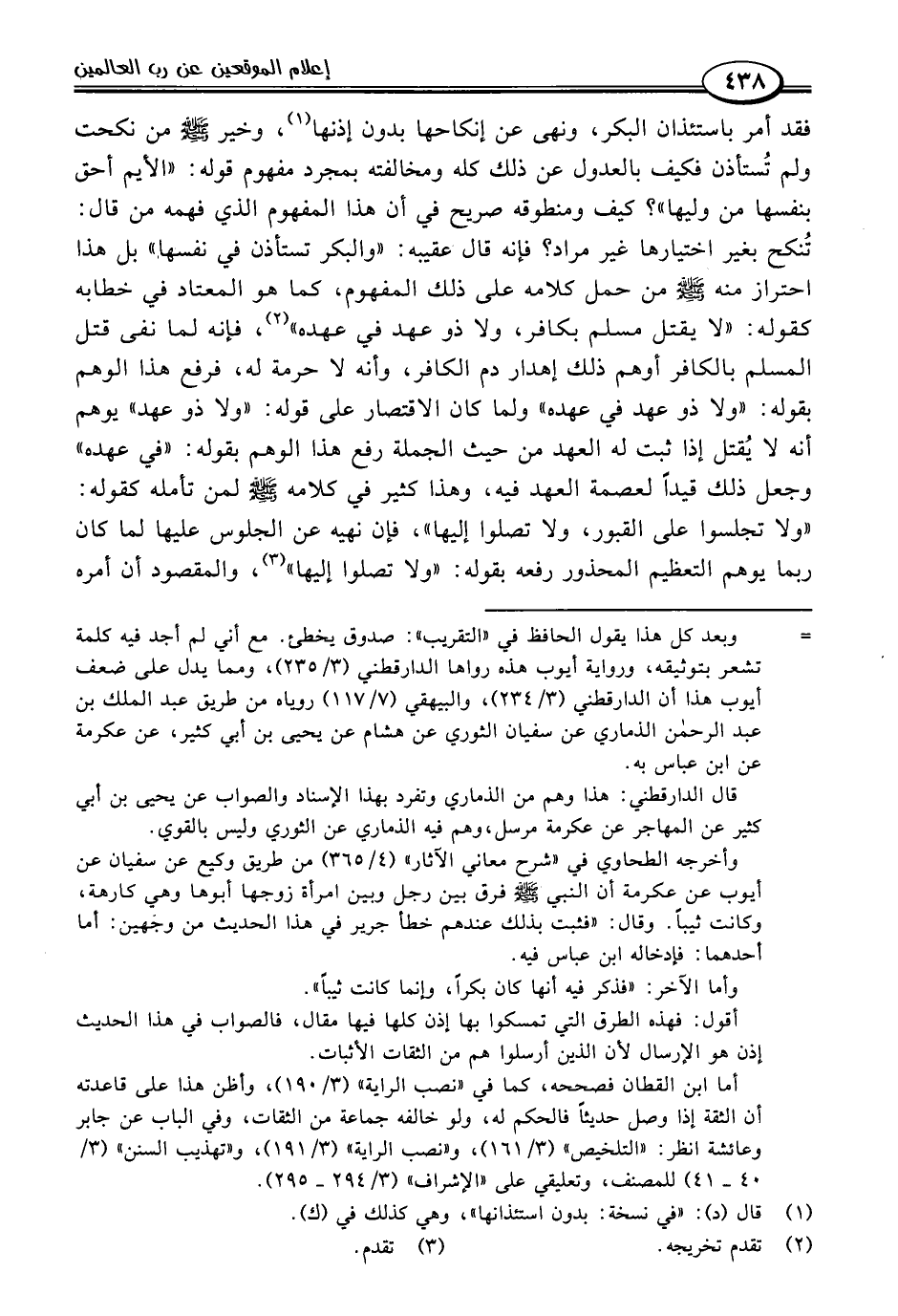 فقد أمر باستئذان البكر، ونهى عن إنكاحها بدون إذنها (١)، وخير -صلى اللَّه عليه وسلم- من نكحت ولم تُستأذن فكيف بالعدول عن ذلك كله ومخالفته بمجرد مفهوم قوله: "الأيم أحق بنفسها من وليها"؟ كيف ومنطوقه صريح في أن هذا المفهوم الذي فهمه من قال: تُنكح بغير اختيارها غير مراد؟ فإنه قال عقيبه: "والبكر تستأذن في نفسها" بل هذا احتراز منه -صلى اللَّه عليه وسلم- من حمل كلامه على ذلك المفهوم، كما هو المعتاد في خطابه كقوله: "لا يقتل مسلم بكافر، ولا ذو عهد في عهده" (٢)، فإنه لما نفى قتل المسلم بالكافر أوهم ذلك إهدار دم الكافر، وأنه لا حرمة له، فرفع هذا الوهم بقوله: "ولا ذو عهد في عهده" ولما كان الاقتصار على قوله: "ولا ذو عهد" يوهم أنه لا يُقتل إذا ثبت له العهد من حيث الجملة رفع هذا الوهم بقوله: "في عهده" وجعل ذلك قيدًا لعصمة العهد فيه، وهذا كثير في كلامه -صلى اللَّه عليه وسلم- لمن تأمله كقوله: "ولا تجلسوا على القبور، ولا تصلوا إليها"، فإن نهيه عن الجلوس عليها لما كان ربما يوهم التعظيم المحذور رفعه بقوله: "ولا تصلوا إليها" (٣)، والمقصود أن أمره