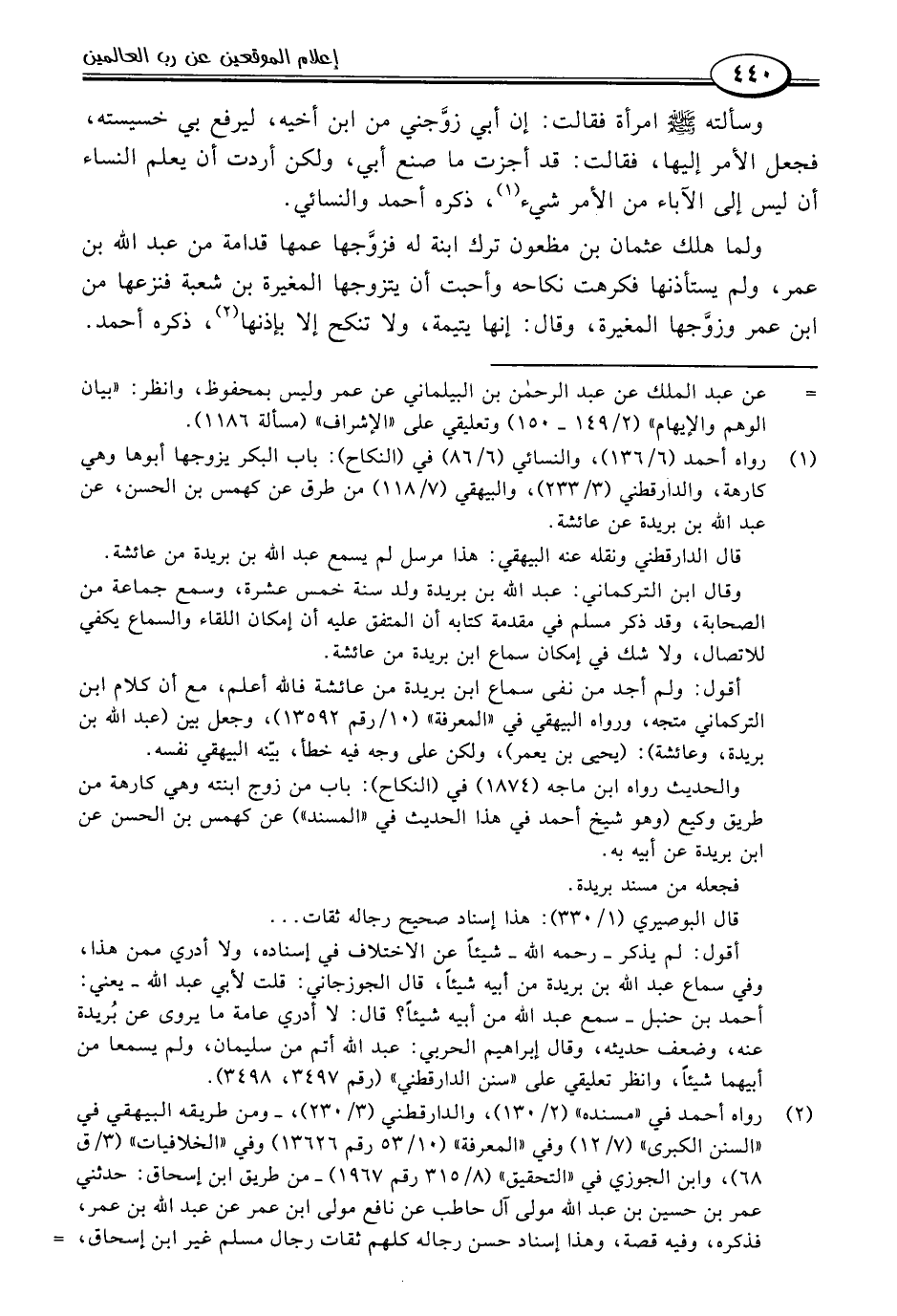 أقول: ولم أجد من نفى سماع ابن بريدة من عائشة فاللَّه أعلم، مع أن كلام ابن التركماني متجه، ورواه البيهقي في "المعرفة" (١٠/ رقم ١٣٥٩٢)، وجعل بين (عبد اللَّه بن بريدة، وعائشة): (يحيى بن يعمر)، ولكن على وجه فيه خطأ، بيّنه البيهقي نفسه.
