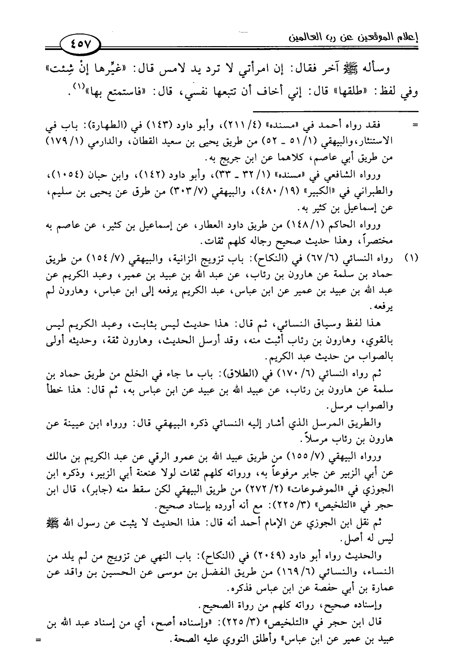 ثم رواه النسائي (٦/ ١٧٠) في (الطلاق): باب ما جاء في الخلع من طريق حماد بن سلمة عن هارون بن رئاب، عن عبيد اللَّه بن عبيد عن ابن عباس به، ثم قال: هذا خطأ والصواب مرسل.