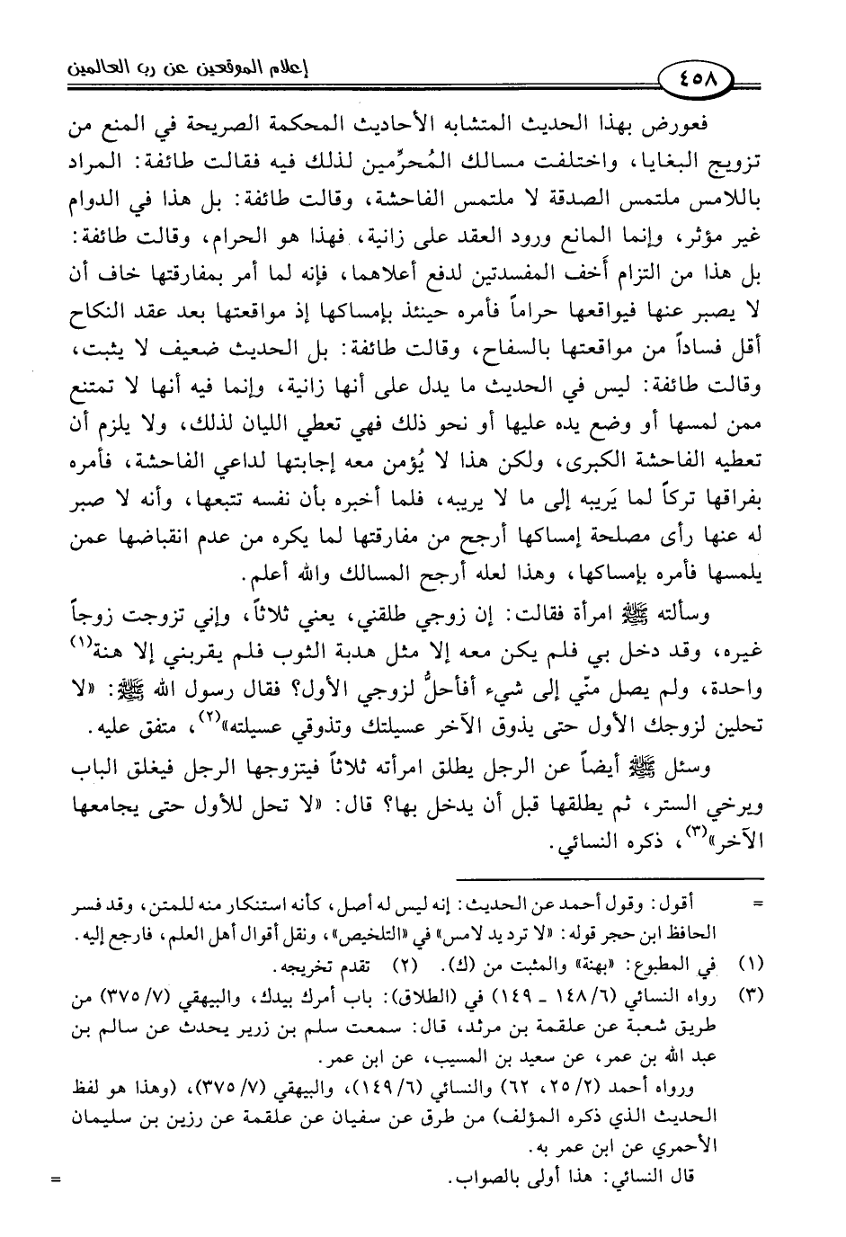 فعورض بهذا الحديث المتشابه الأحاديث المحكمة الصريحة في المنع من تزويج البغايا، واختلفت مسالك المُحرِّمين لذلك فيه فقالت طائفة: المراد باللامس ملتمس الصدقة لا ملتمس الفاحشة، وقالت طائفة: بل هذا في الدوام غير مؤثر، وإنما المانع ورود العقد على زانية، فهذا هو الحرام، وقالت طائفة: بل هذا من التزام أَخف المفسدتين لدفع أعلاهما، فإنه لما أمر بمفارقتها خاف أن لا يصبر عنها فيواقعها حرامًا فأمره حينئذ بإمساكها إذ مواقعتها بعد عقد النكاح أقل فسادًا من مواقعتها بالسفاح، وقالت طائفة: بل الحديث ضعيف لا يثبت، وقالت طائفة: ليس في الحديث ما يدل على أنها زانية، وإنما فيه أنها لا تمتنع ممن لمسها أو وضع يده عليها أو نحو ذلك فهي تعطي الليان لذلك، ولا يلزم أن تعطيه الفاحشة الكبرى، ولكن هذا لا يُؤمن معه إجابتها لداعي الفاحشة، فأمره بفراقها تركًا لما يَريبه إلى ما لا يريبه، فلما أخبره بأن نفسه تتبعها، وأنه لا صبر له عنها رأى مصلحة إمساكها أرجح من مفارقتها لما يكره من عدم انقباضها عمن يلمسها فأمره بإمساكها، وهذا لعله أرجح المسالك واللَّه أعلم.