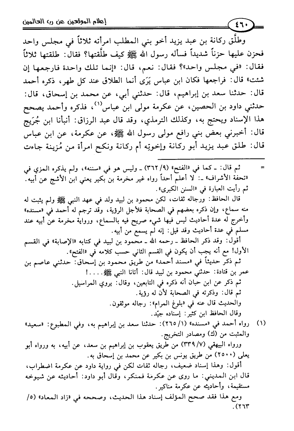وطلَّق ركانة بن عبد يزيد أخو بني المطلب امرأته ثلاثًا في مجلس واحد فحزن عليها حزنًا شديدًا فسأله رسول اللَّه -صلى اللَّه عليه وسلم- كيف طلَّقتها؟ فقال: طلقتها ثلاثًا فقال: "في مجلس واحد"؟ فقال: نعم، قال: "إنما تلك واحدة فارجعها إن شئت" قال: فراجعها فكان ابن عباس يَرَى أنما الطلاق عند كل طهر، ذكره أحمد قال: حدثنا سعد بن إبراهيم، قال: حدثني أبي، عن محمد بن إسحاق، قال: حدثني داود بن الحصين، عن عكرمة مولى ابن عباس (١)، فذكره وأحمد يصحح هذا الإسناد ويحتج به، وكذلك الترمذي، وقد قال عبد الرزاق: أنبأنا ابن جُرَيج قال: أخبرني بعض بني رافع مولى رسول اللَّه -صلى اللَّه عليه وسلم-، عن عكرمة، عن ابن عباس قال: طلق عبد يزيد أبو ركانة وإخوتِه أم ركانة ونكح امرأة من مُزينة جاءت