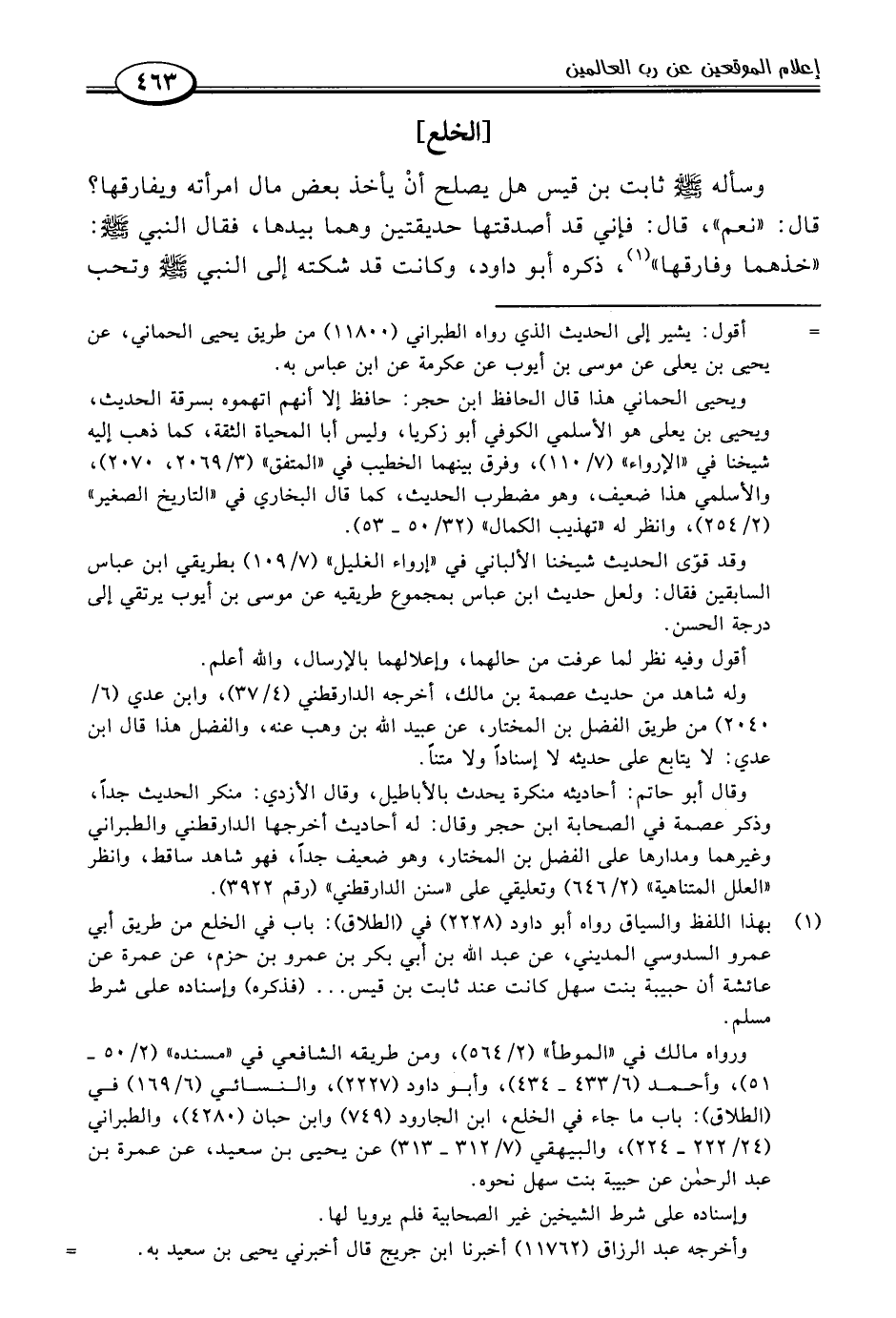 (١) بهذا اللفظ والسياق رواه أبو داود (٢٢٢٨) في (الطلاق): باب في الخلع من طريق أبي عمرو السدوسي المديني، عن عبد اللَّه بن أبي بكر بن عمرو بن حزم، عن عمرة عن عائشة أن حبيبة بنت سهل كانت عند ثابت بن قيس. . . (فذكره) وإسناده على شرط مسلم.
