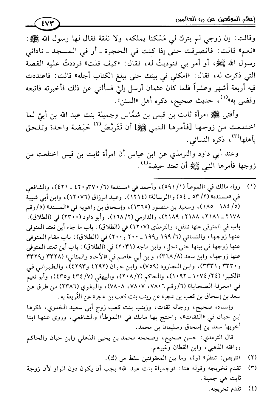 (١) رواه مالك في "الموطأ" (١/ ٥٩١)، وأحمد في "مسنده" (٦/ ٣٧٠ و ٤٢٠ - ٤٢١)، والشافعي في "مسنده" (٢/ ٥٣ - ٥٤) و"الرسالة" (١٢١٤)، وعبد الرزاق (١٢٠٧٦)، وابن أبي شيبة (٥/ ١٨٤ - ١٨٥)، وسعيد بن منصور (١٣٦٥)، وإسحاق بن راهويه في "المسند" (٥/ رقم ٢١٧٨ - ٢١٨١، ٢١٨٨، ٢١٨٩)، والدارمي (٢/ ١٦٨)، وأبو داود (٢٣٠٠) في (الطلاق): باب في المتوفى عنها تنتقل، والترمذي (١٢٠٧) في (الطلاق): باب ما جاء أين تعتد المتوفى عنها زوجها، والنسائي (٦/ ١٩٩ و ١٩٩ - ٢٠٠ و ٢٠٠) في (الطلاق): باب مقام المتوفى عنها زوجها في بيتها حتى تحل، وابن ماجه (٢٠٣١) في (الطلاق): باب أين تعتد المتوفى عنها زوجها، وابن سعد (٨/ ٣٦٨)، وابن أبي عاصم في "الآحاد والمثاني" (٣٣٢٨ و ٣٣٢٩ و ٣٣٣٠ و ٣٣٣١)، وابن الجارود (٧٥٩)، وابن حبان (٤٢٩٢ و ٤٢٩٣)، والطبراني في "الكبير" (٢٤/ ١٠٧٤ - ١٠٩٢)، والحاكم (٢/ ٢٠٨)، والبيهقي (٧/ ٤٣٤ و ٤٣٥)، وأبو نعيم في "معرفة الصحابة" (٦/ رقم ٧٨٠٦، ٧٨٠٧، ٧٨٠٨)، والبغوي (٢٣٨٦) من طرق عن سعد بن إسحاق بن كعب بن عجرة عن زينب بنت كعب بن عجرة عن الفُريعة به.