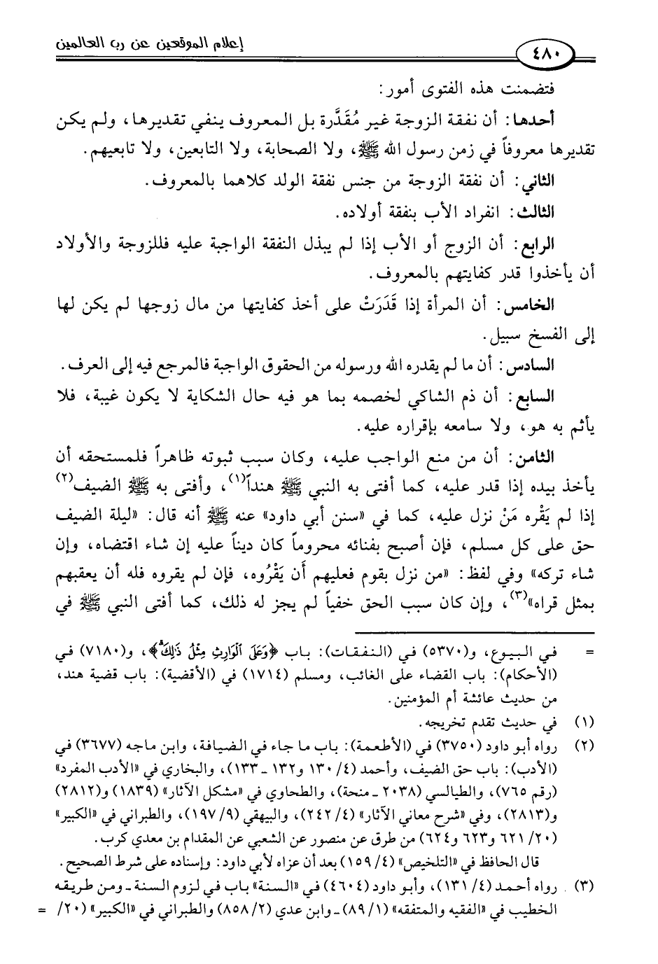 الثامن: أن من منع الواجب عليه، وكان سبب ثبوته ظاهرًا فلمستحقه أن يأخذ بيده إذا قدر عليه، كما أفتى به النبي -صلى اللَّه عليه وسلم- هندًا (١)، وأفتى -صلى اللَّه عليه وسلم- الضيف (٢) إذا لم يَقْره مَنْ نزل عليه، كما في "سنن أبي داود" عنه -صلى اللَّه عليه وسلم- أنه قال: "ليلة الضيف حق على كل مسلم، فإن أصبح بفنائه محرومًا كان دينًا عليه إن شاء اقتضاه، وإن شاء تركه" وفي لفظ: "من نزل بقوم فعليهم أَن يَقْرُوه، فإن لم يقروه فله أن يعقبهم بمثل قراه" (٣)، وإن كان سبب الحق خفيًا لم يجز له ذلك، كما أفتى النبي -صلى اللَّه عليه وسلم- في