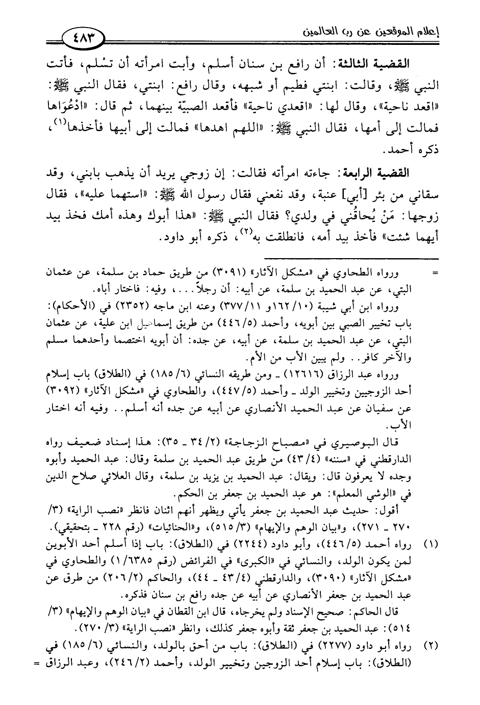 (١) رواه أحمد (٥/ ٤٤٦)، وأبو داود (٢٢٤٤) في (الطلاق): باب إذا أسلم أحد الأبوين لمن يكون الولد، والنسائي في "الكبرى" في الفرائض (رقم ٦٣٨٥/ ١) والطحاوي في "مشكل الآثار" (٣٠٩٠)، والدارقطني (٤/ ٤٣ - ٤٤)، والحاكم (٢/ ٢٠٦) من طرق عن عبد الحميد بن جعفر الأنصاري عن أبيه عن جده رافع بن سنان فذكره.