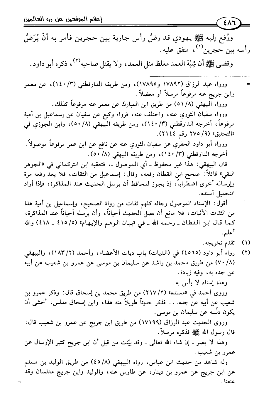(٢) رواه أبو داود (٤٥٦٥) في (الديات) باب ديات الأعضاء، وأحمد (٢/ ١٨٣)، والبيهقي (٨/ ٧٠) من طريق محمد بن راشد عن سليمان بن موسى عن عمرو بن شعيب عن أبيه عن جده به، وفيه زيادة.