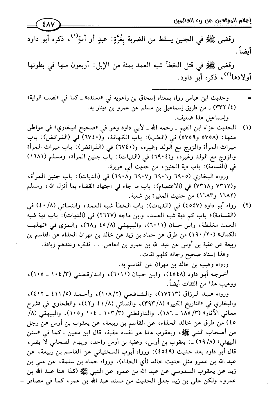 (٢) رواه أبو داود (٤٥٤٧) في (الديات): باب الخطأ شبه العمد، والنسائي (٨/ ٤٠) في (القسامة)؛ باب كم دية شبه العمد، وابن ماجه (٢٦٢٧) في (الديات): باب دية شبه العمد مغلظة، وابن حبان (٦٠١١)، والبيهقي (٨/ ٤٥ و ٦٨)، والمزي في "تهذيب الكمال" (٢٠/ ١٩٠) من طرق عن حماد بن زيد عن خالد بن مهران الحذاء عن القاسم بن ربيعة عن عقبة بن أوس عن عبد اللَّه بن عمرو بن العاص. . . فذكره وعندهم زيادة.
