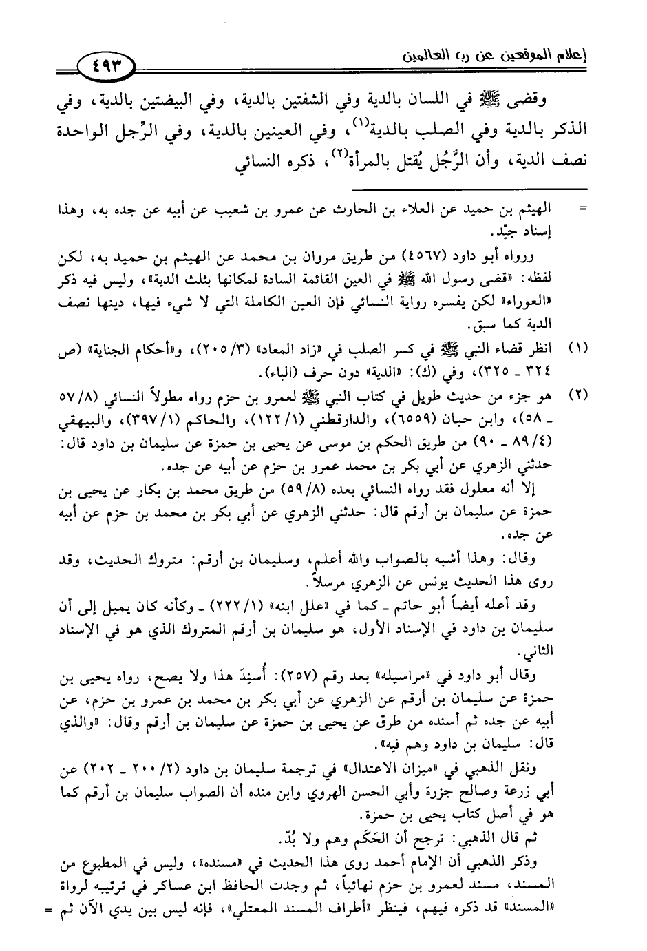 (٢) هو جزء من حديث طويل في كتاب النبي -صلى اللَّه عليه وسلم- لعمرو بن حزم رواه مطولًا النسائي (٨/ ٥٧ - ٥٨)، وابن حبان (٦٥٥٩)، والدارقطني (١/ ١٢٢)، والحاكم (١/ ٣٩٧)، والبيهقي (٤/ ٨٩ - ٩٠) من طريق الحكم بن موسى عن يحيى بن حمزة عن سليمان بن داود قال: حدثني الزهري عن أبي بكر بن محمد عمرو بن حزم عن أبيه عن جده.